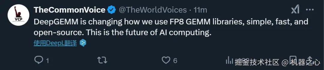 还有人评价说,「DeepGEMM 正在改变我们使用 FP8 GEMM 库的方式,它简洁、快速且开源。这正是 AI 计算的未来。」