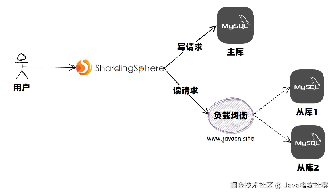 ShardingSphere 通过 JDBC 驱动层透明代理实现读写分离,其核心逻辑为: