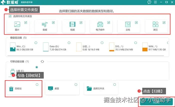 除了Recuva,小编其实还有自己最为常用的一款宝藏电脑数据恢复软件,即数据 蛙恢复专家。这款软件对新手用户十分友好,就算是第一次使用这款软件的电脑小白也不会在操作上觉得有困难。如何恢复回收站已删除东西?它能够让用户自由选择需要扫描的电脑位置,如大家常常丢失文件的回收站。能够通过这款软件扫描并恢复的文件类型十分丰富,除了常见的文档、图片,还包括音频、视频、电子邮件等等。如果有想要使用数据 蛙恢复专家进行回收站恢复的朋友,可以参考一下下面的使用步骤解说: