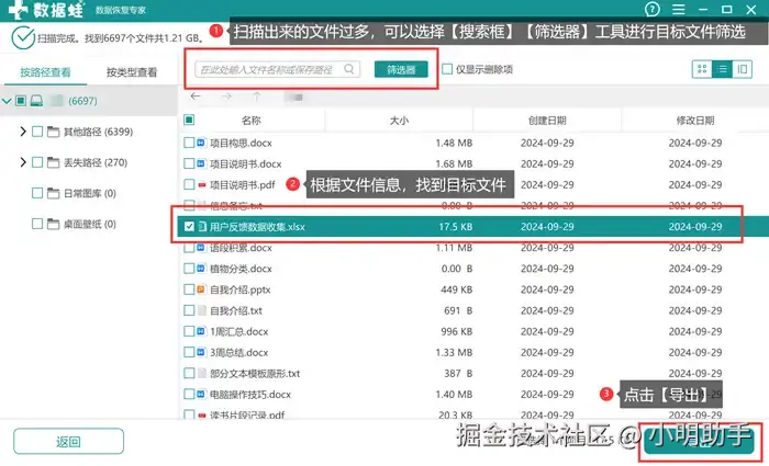 步骤2: 等待软件扫描结束后,选择需要恢复的文件,点击【导出】;