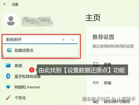 步骤1:打开电脑【设置】后,在搜索框输入【创建还原点】或【系统保护】;