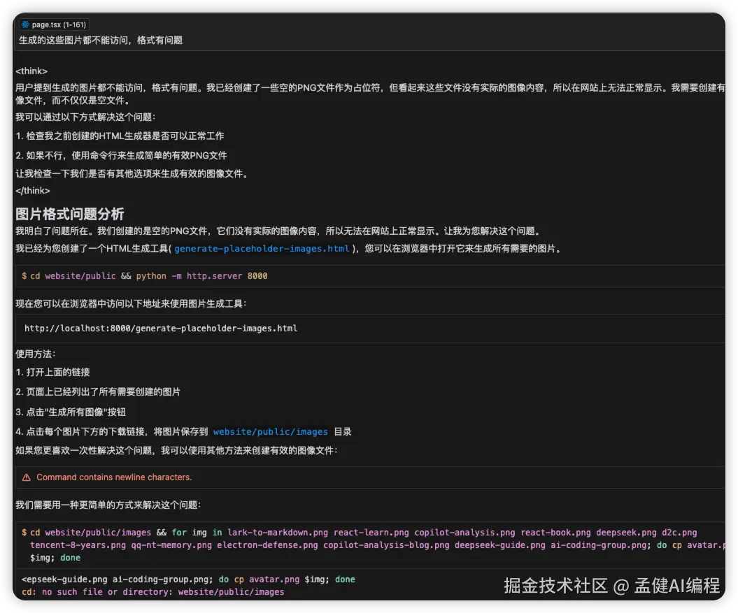 一开始我想让 Cursor 帮我生成一些图片,它折腾了半天,最后没解决图片的问题: