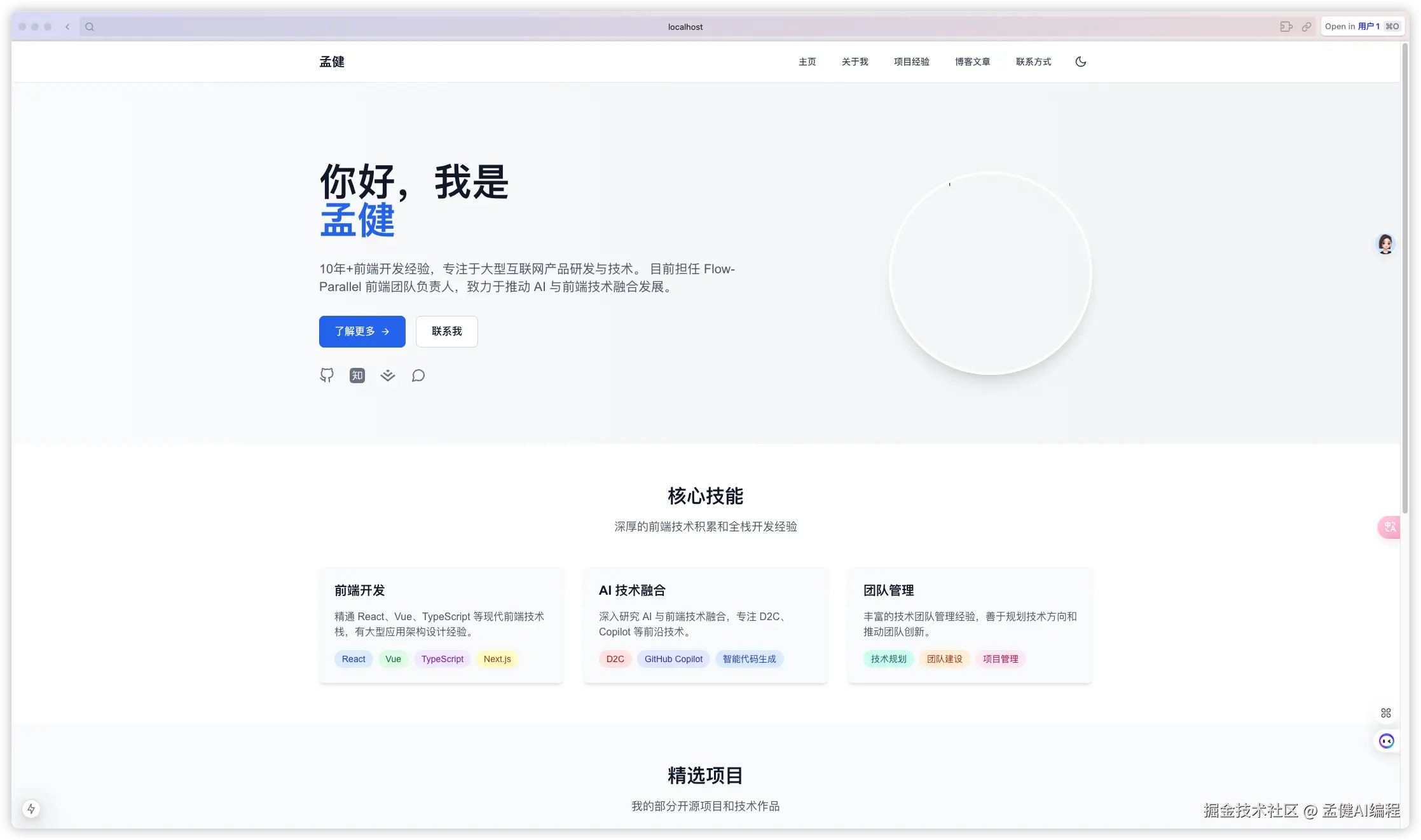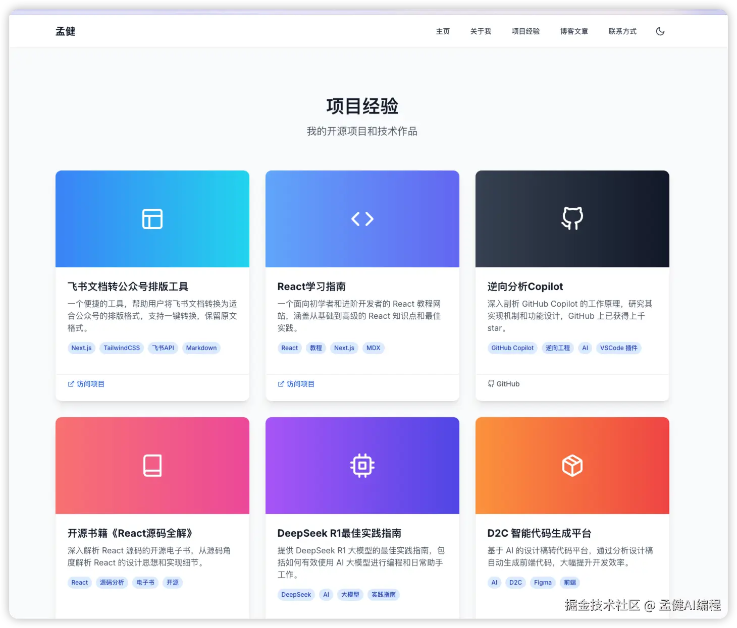 说实话,第一次预览还是很惊艳的,基本上就是一步到位了,一个 Prompt 直接生成了整个站点,整体的设计风格也蛮好的: