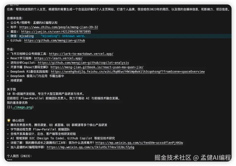 首先,我准备了一个 Markdown 文件,包含我的个人资料和网站需求: