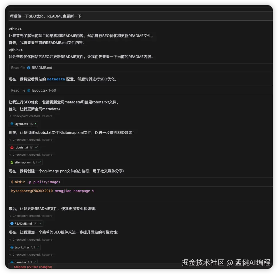 接下来让它帮我优化一下 SEO,顺便把 README 生成了: