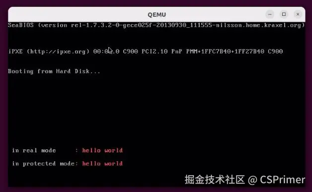 我们来运行一下,qemu运行以后它就会执行它内置的BIOS程序,然后BIOS就会从虚拟硬盘的第一个扇区,去加载bootloader程序执行,bootloader首先会在实模式下面去打印hello word,然后切换到保护模式,在保护模式下面再去打印hello word,这样我们的bootloader程序就启动成功了.