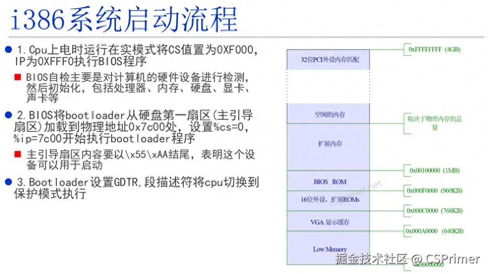 搞清楚了i386分段机制以后,我们来看bootloader是怎么启动的。下图就是32位CPU的物理地址空间范围,前面的1M是之前的8086的地址空间,从0到640K就是之前的8086可以使用的物理内存,从640到768是VGG显存空间,往这个区域写入字符就可以在显示器里显示,768-960是用来映射到外设,960-1M就是映射到BIOS ROM,BIOS程序是放在ROM里面,ROM跟RAM一样通过地址就可以访问,1M以上就是32位CPU的物理内存,最上面的一点是映射到32位CPU的外设。