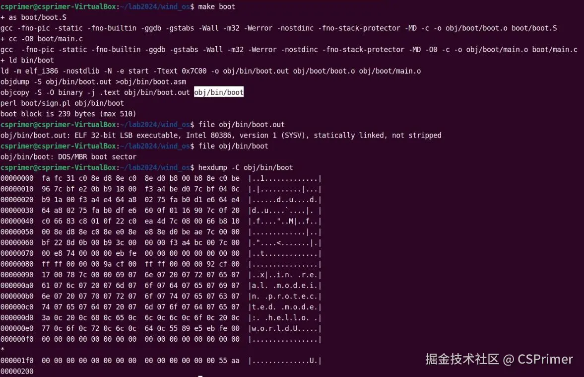 然后我们编译执行boot这个目标来看一下,那么就是执行make boot,它就根据boot.s生成boot.o,main.c生成mian.o,然后使用链接器,把boot.o跟main.o链接成可执行文件boot.out,再把boot.out里面的代码段提取出来,放在boot文件里面,我们通过file命令看一下,boot.out它就是一个ELF的文件,然后这个boot它就是一个二进制的文件,它里面只有代码,我们通过hexdump来看一下,可以看到它里面就是二进制的代码,