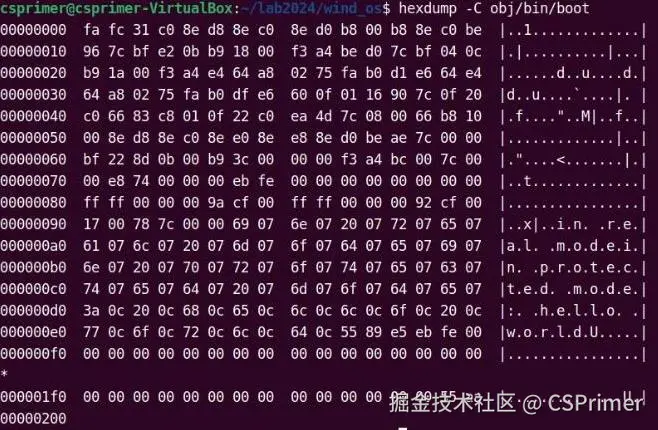 从下面hexdump -C boot我们也可以看出boot后面扩展的是0,最后面两个字节是55AA,所以它就符合主引导扇区的格式,