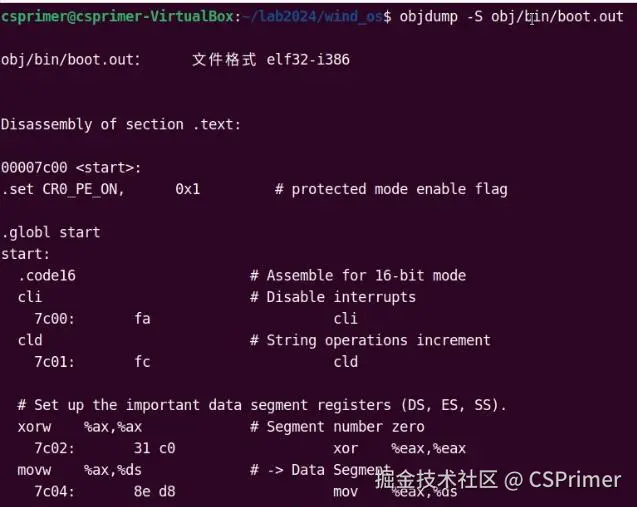 我们通过objdump来看一下boot.out里面的代码段如下图,可以看到代码段的内容就是fa fc 31 c0,就上图boot里的fa fc 31 c0,所以把boot这个文件内容加载到7C00的地方,CPU就可以直接执行,从下图我们也可以看出代码段它的地址是7C00,