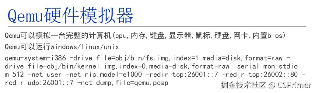 你可以认为qemu跟一个正式的计算机是一模一样的,qemu里面可以运行Windows Linux Unix,如果你写的bootloader和OS可以在qemu里面运行,那么理论上你的代码不用做任何修改,就可以在一个正式的机器上去运行,qemu的运行也比较简单,就执行qemu-system-i386这个命令,然后设置一个虚拟的硬盘,硬盘里面存放的就是你的代码bootloader程序,