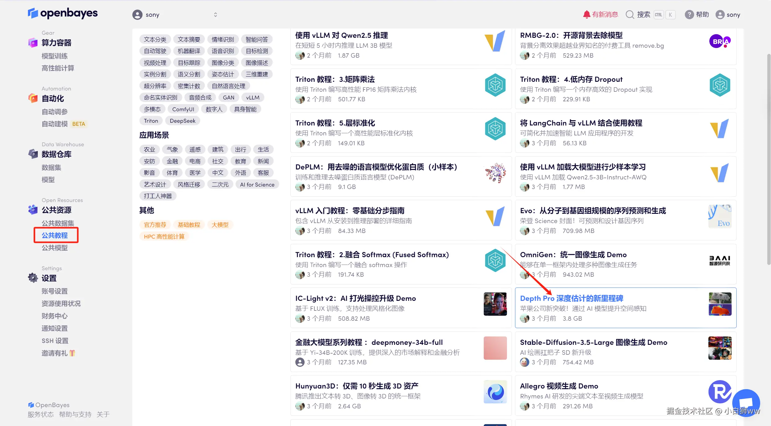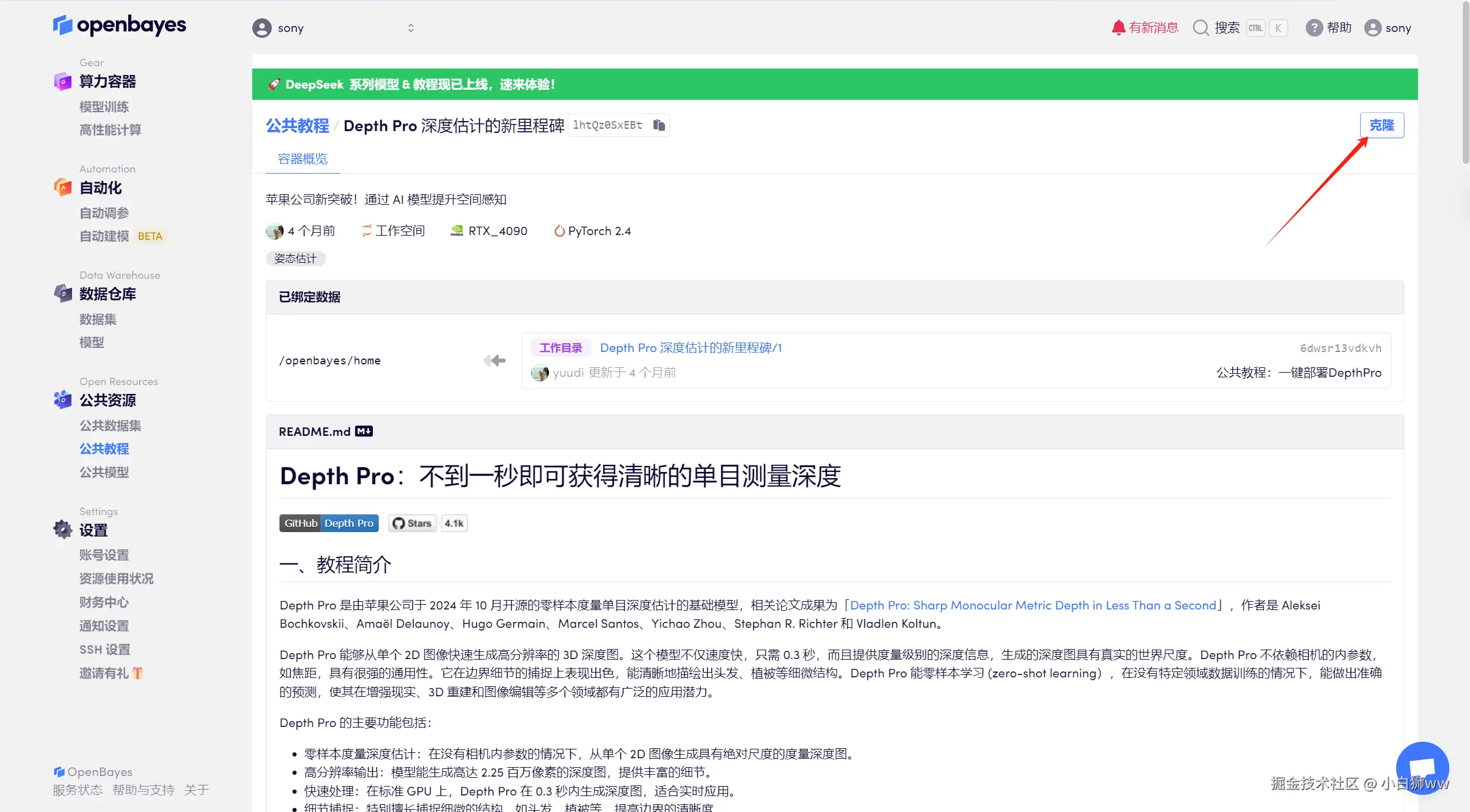 登录 OpenBayes.com,在「公共教程」页面,选择「Depth Pro 深度估计的新里程碑」教程。