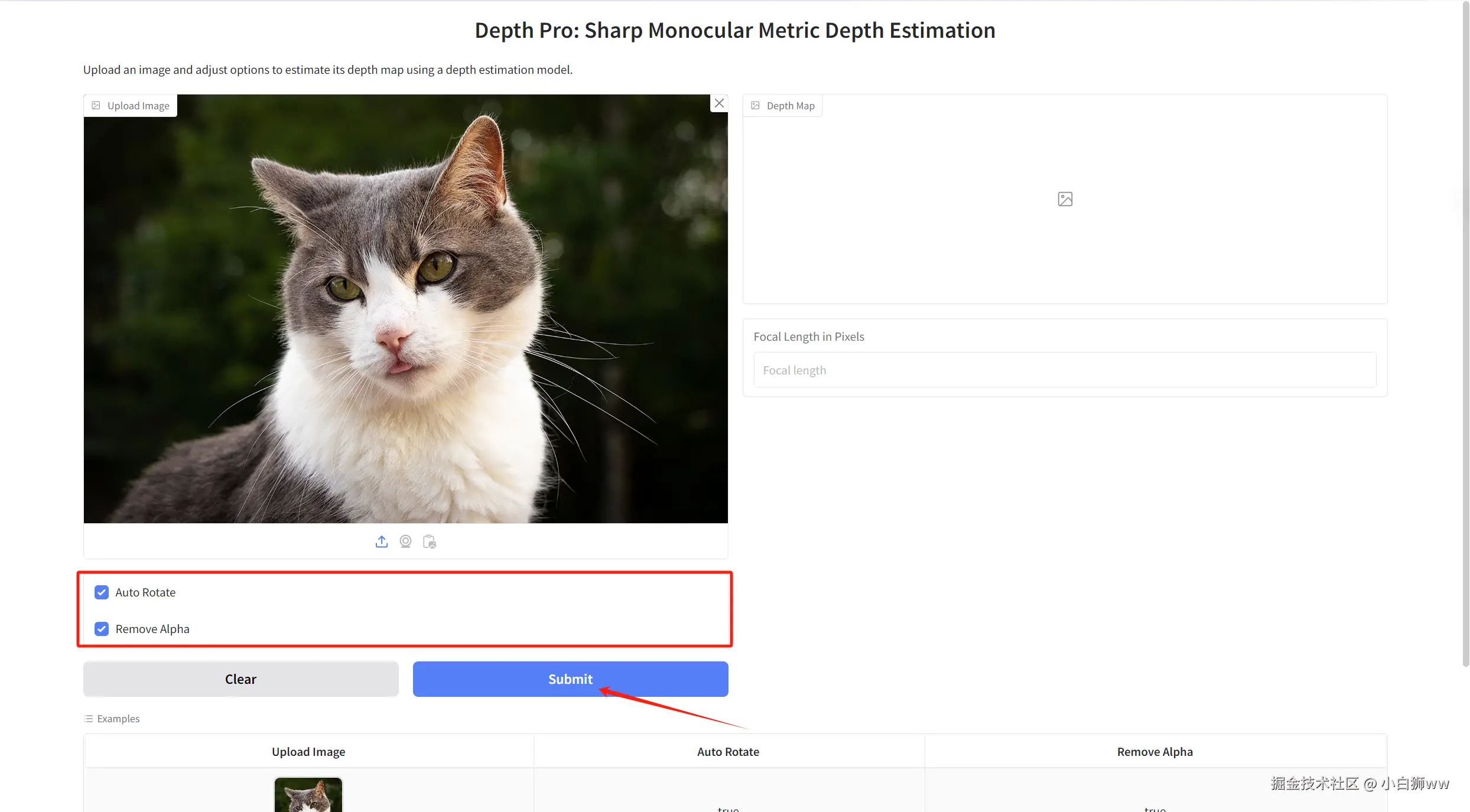 进入 Demo 界面后,我们先上传一张图片,点击「Auto Rotate」和「Remove Alpha」调节参数。最后点击「Submit」生成。