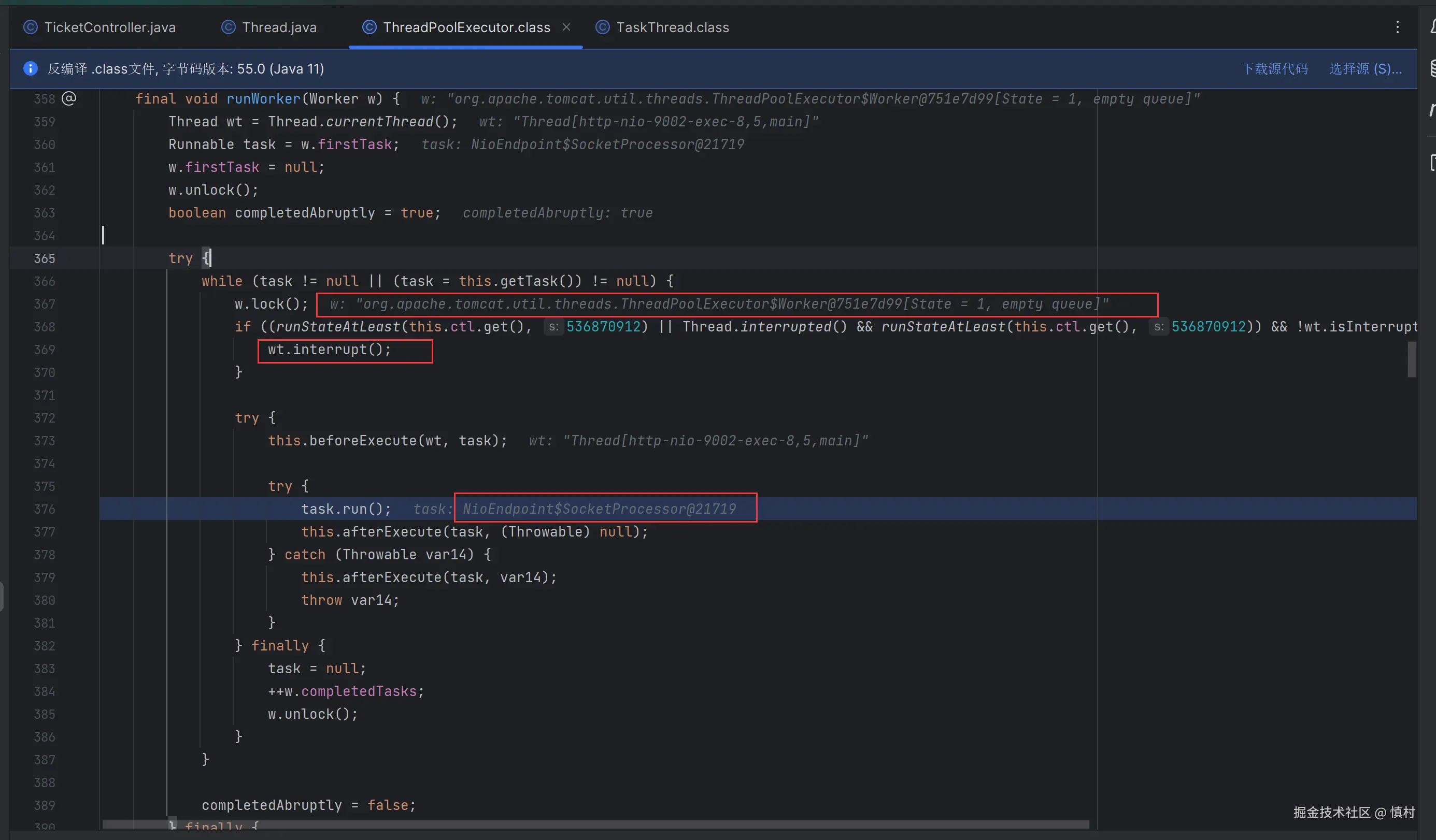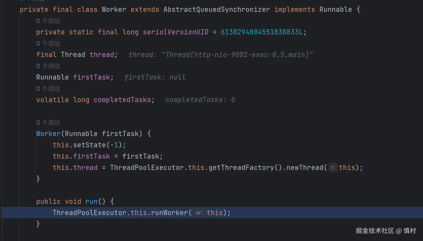 当 run 方法被调用时,它实际上是在请求 ThreadPoolExecutor 执行其 runWorker 方法,并将当前的 Worker 实例作为参数传递。