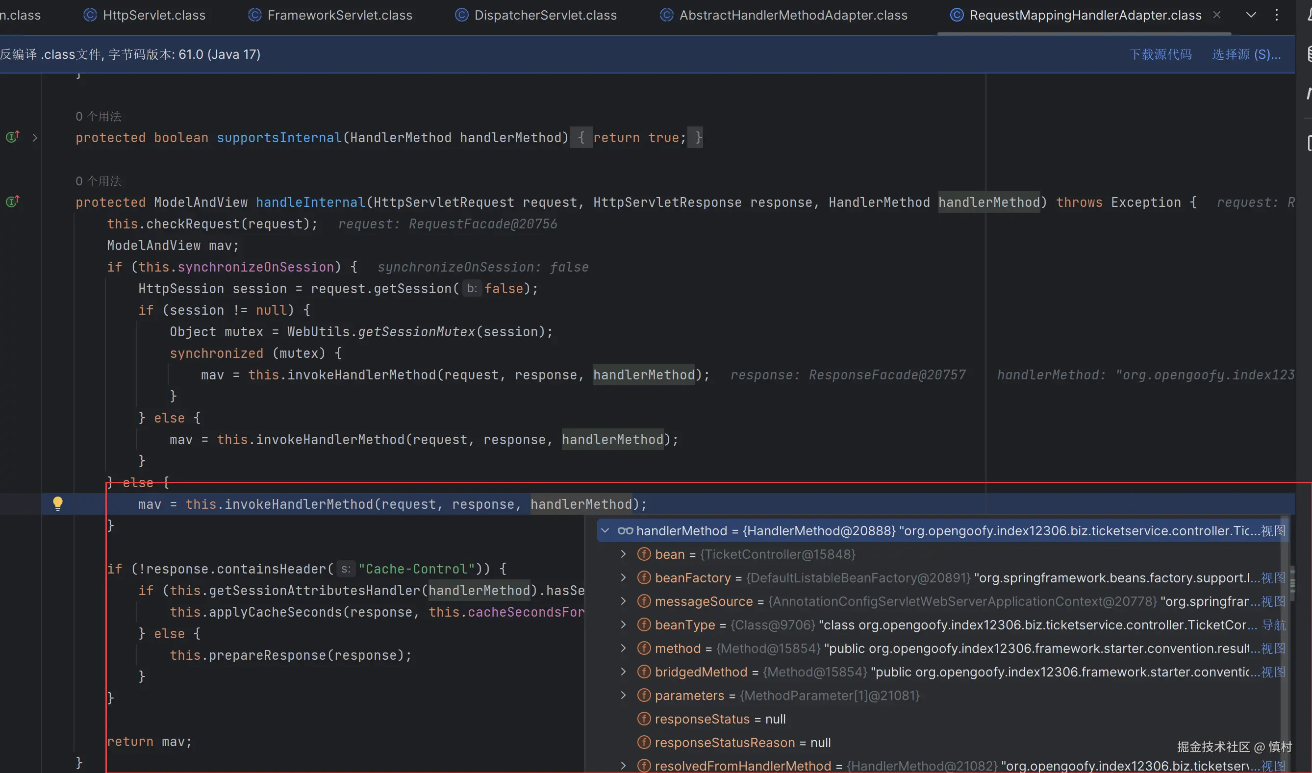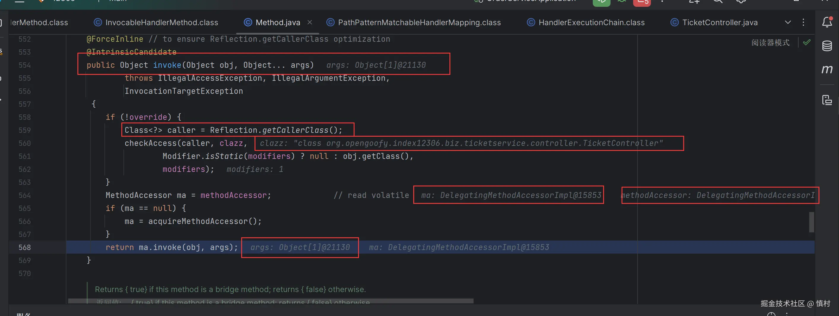 MethodAccessorImpl acc = (MethodAccessorImpl) new MethodAccessorGenerator().generateMethod(...):使用MethodAccessorGenerator生成一个新的MethodAccessorImpl实例,这个新实例将用于后续的方法调用。生成的方法访问器基于目标方法的类、名称、参数类型、返回类型、异常类型和修饰符。