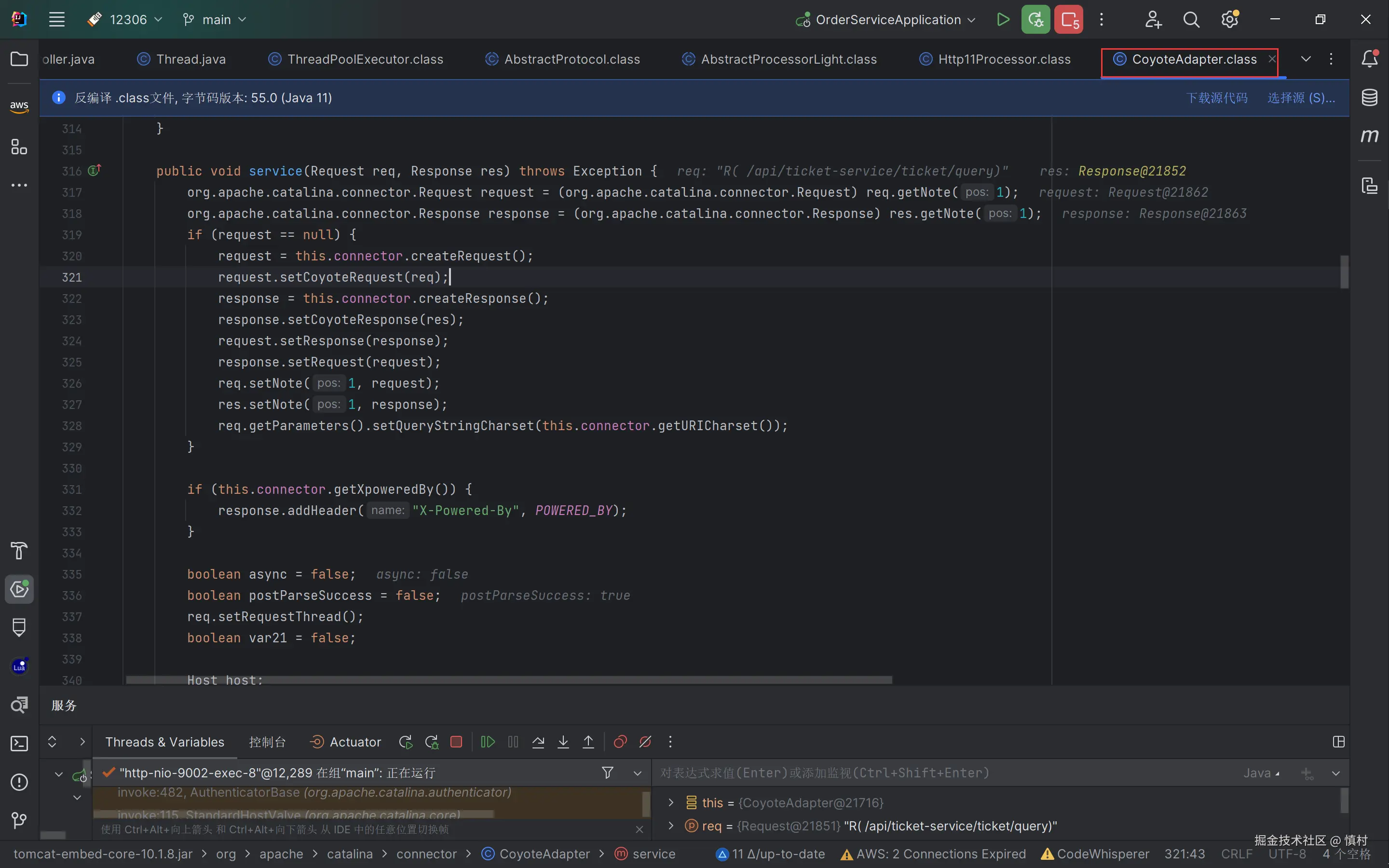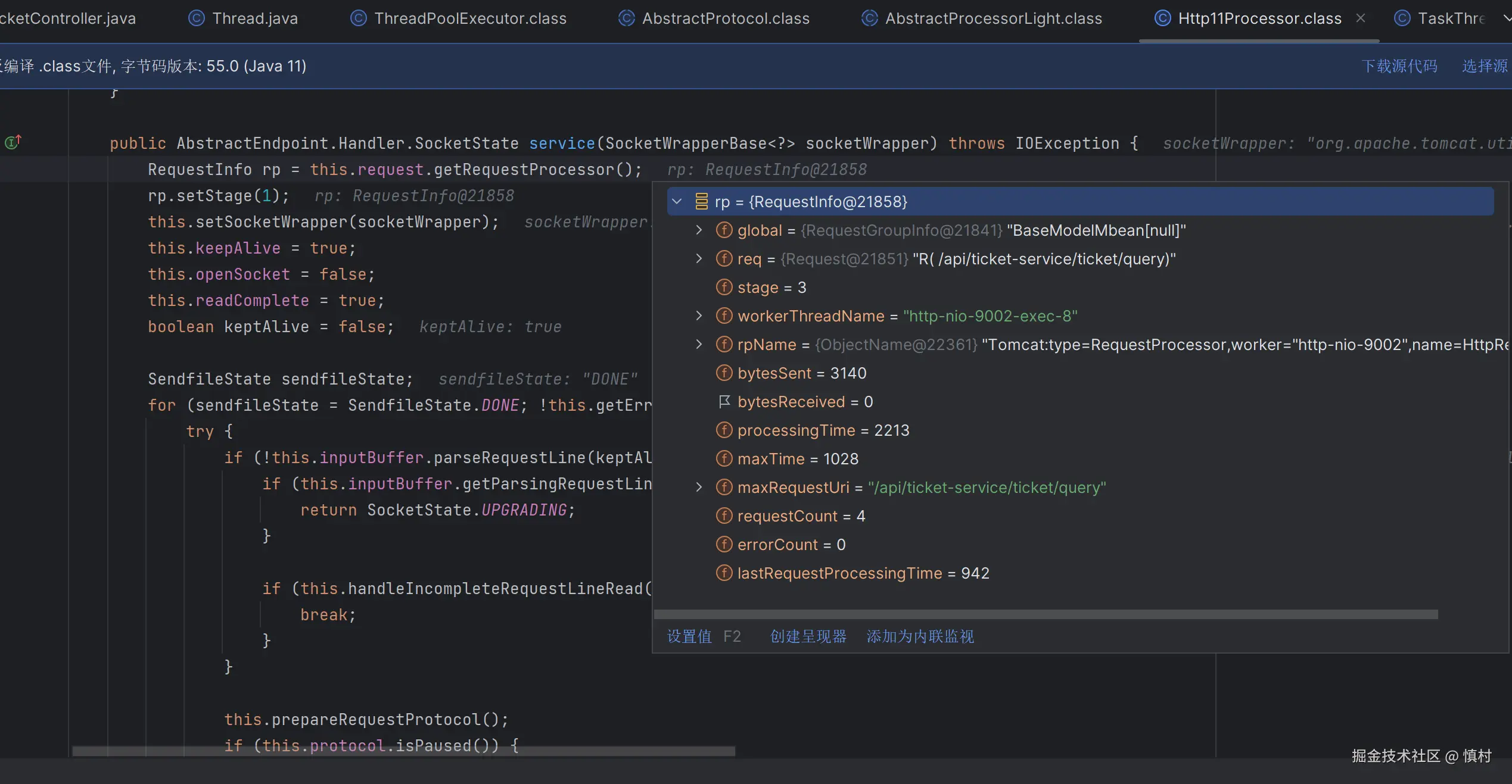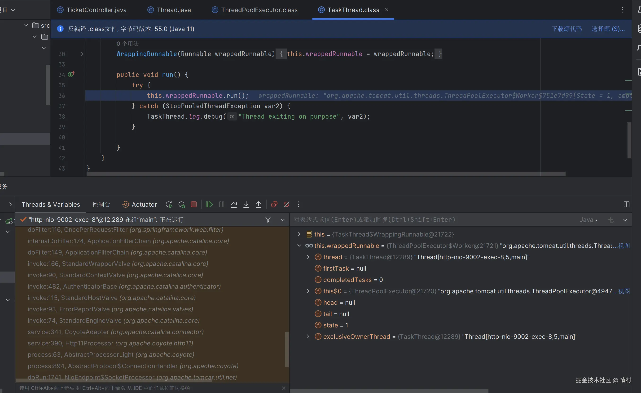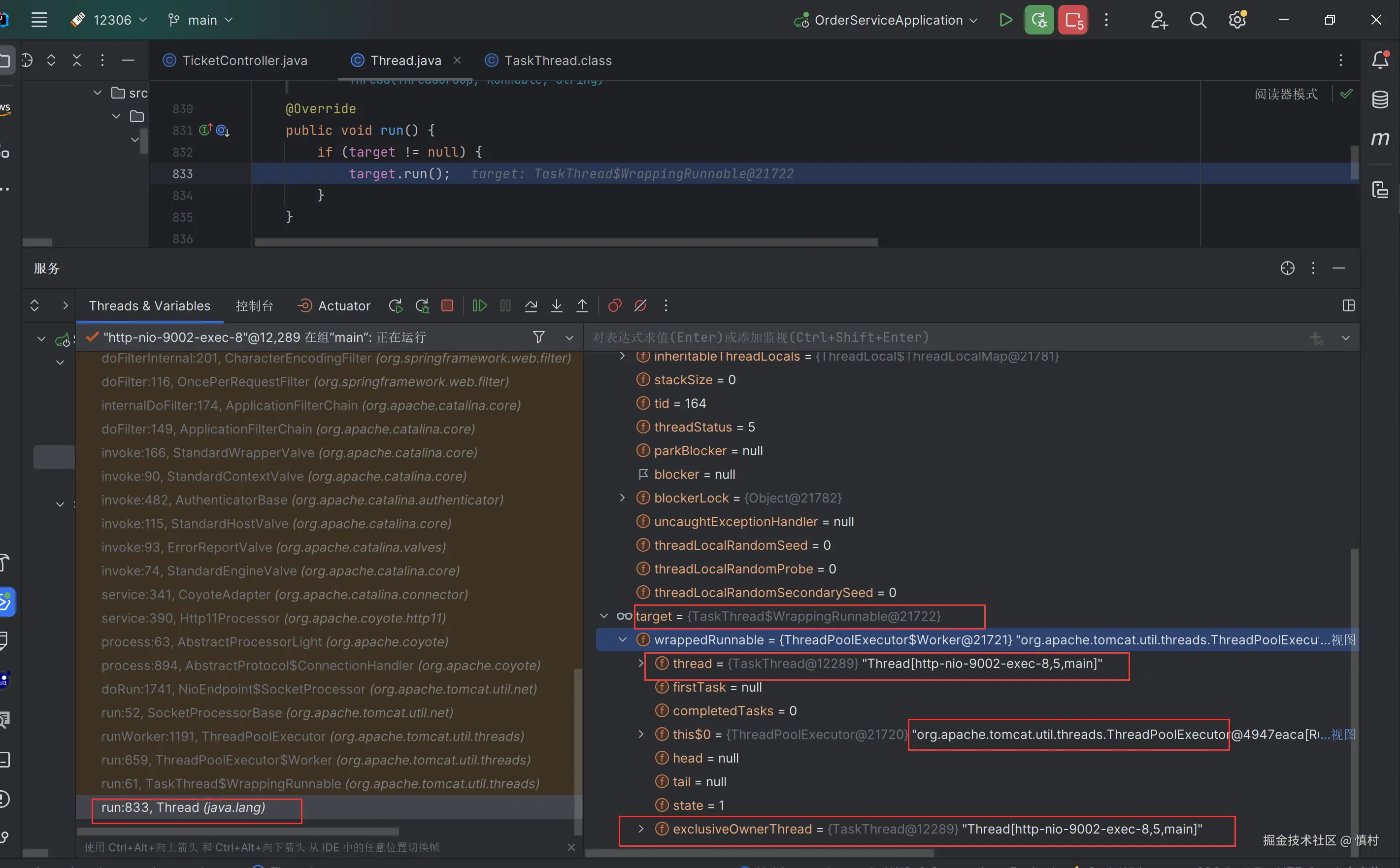 在此可以看到,线程命名为9002,是ticket接口的部分,调用了tomcat的线程池处理任务。tomcat的池子默认大小为10,核心线程数为10,最大线程数为200,ctl为RUNNING