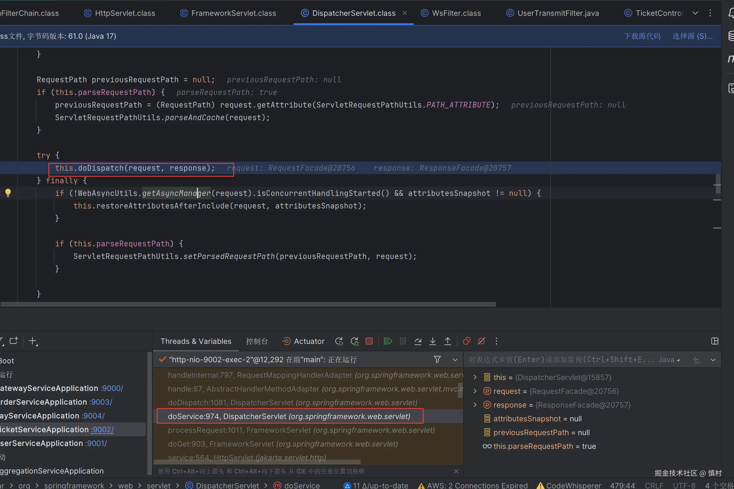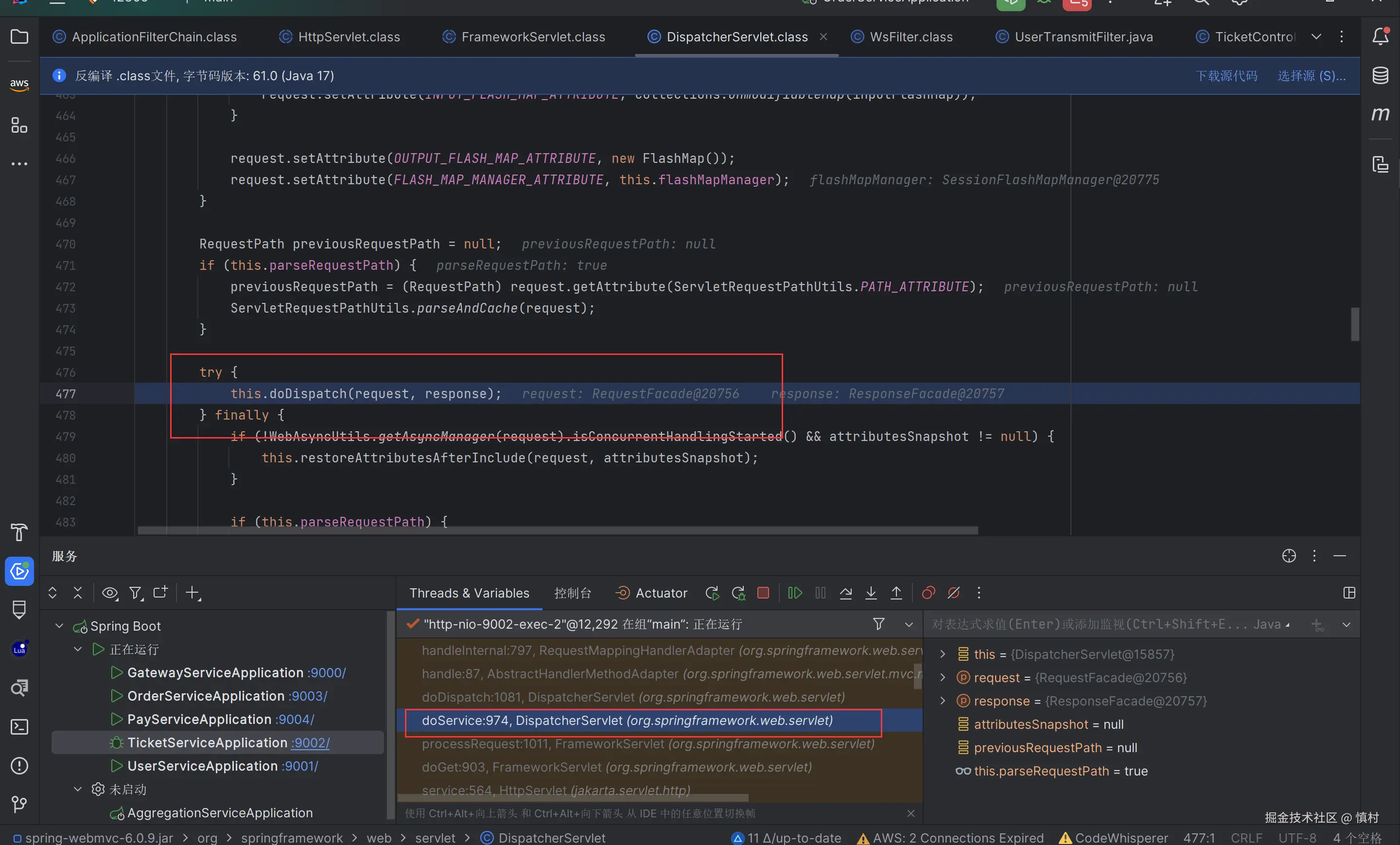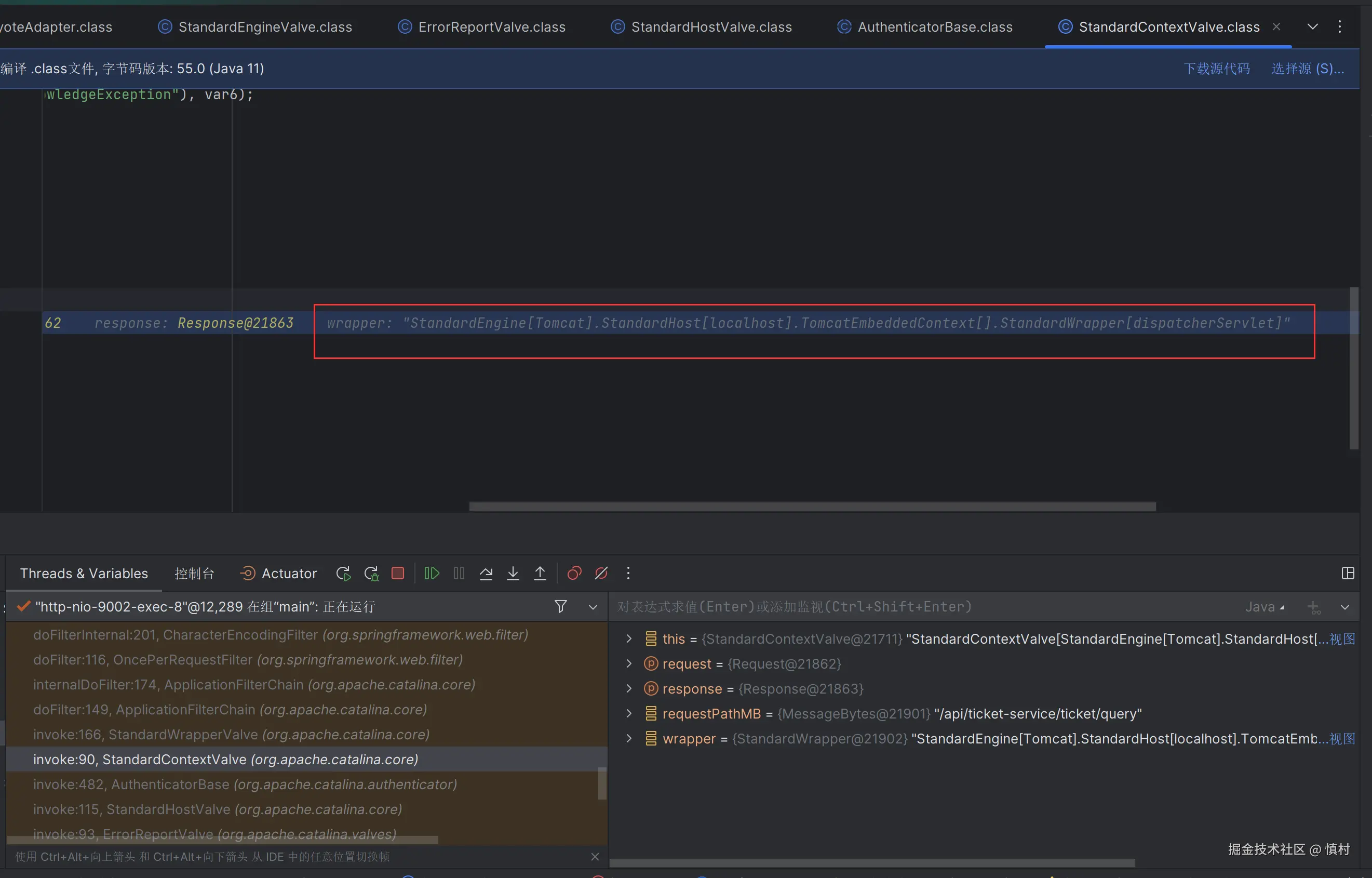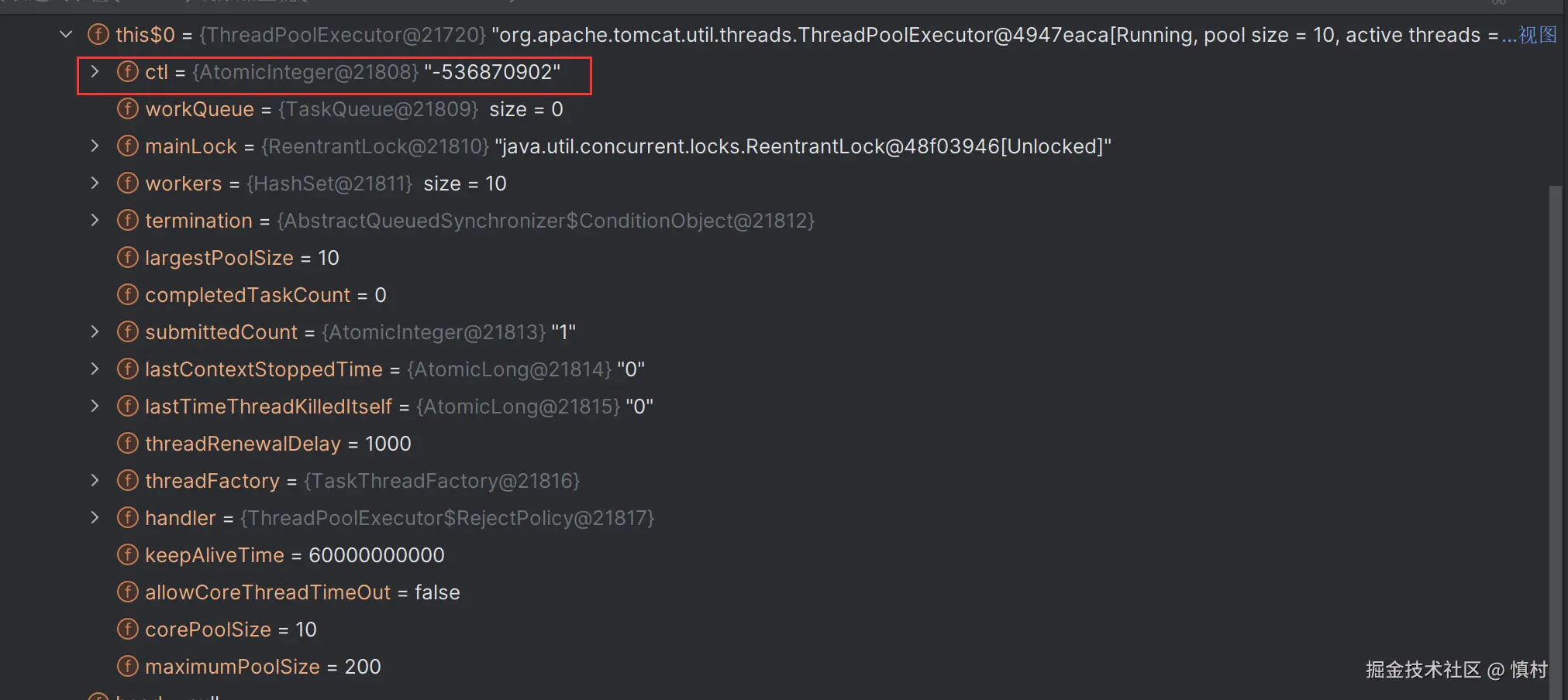 在此可以看到,线程命名为9002,是ticket接口的部分,调用了tomcat的线程池处理任务。tomcat的池子默认大小为10,核心线程数为10,最大线程数为200,ctl为RUNNING