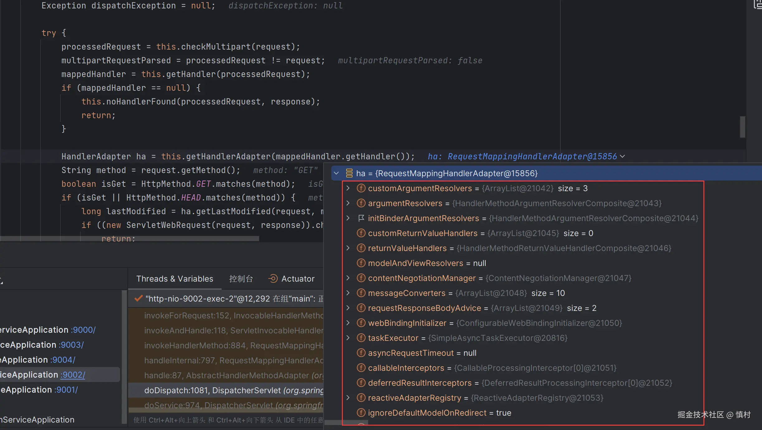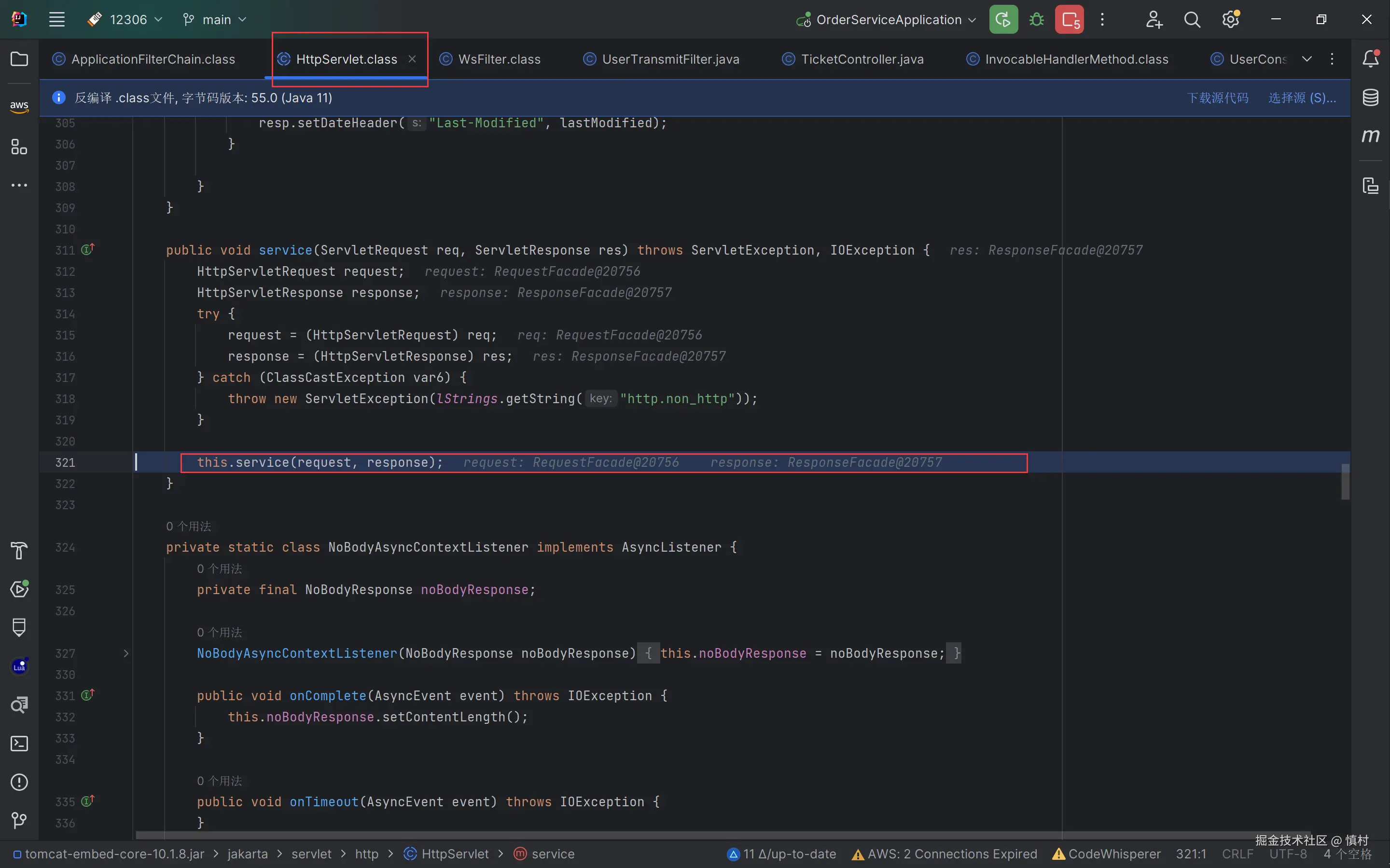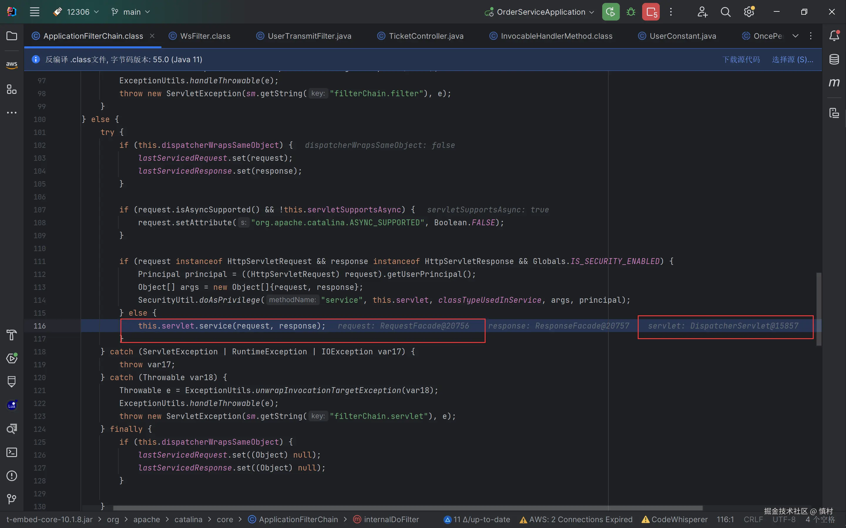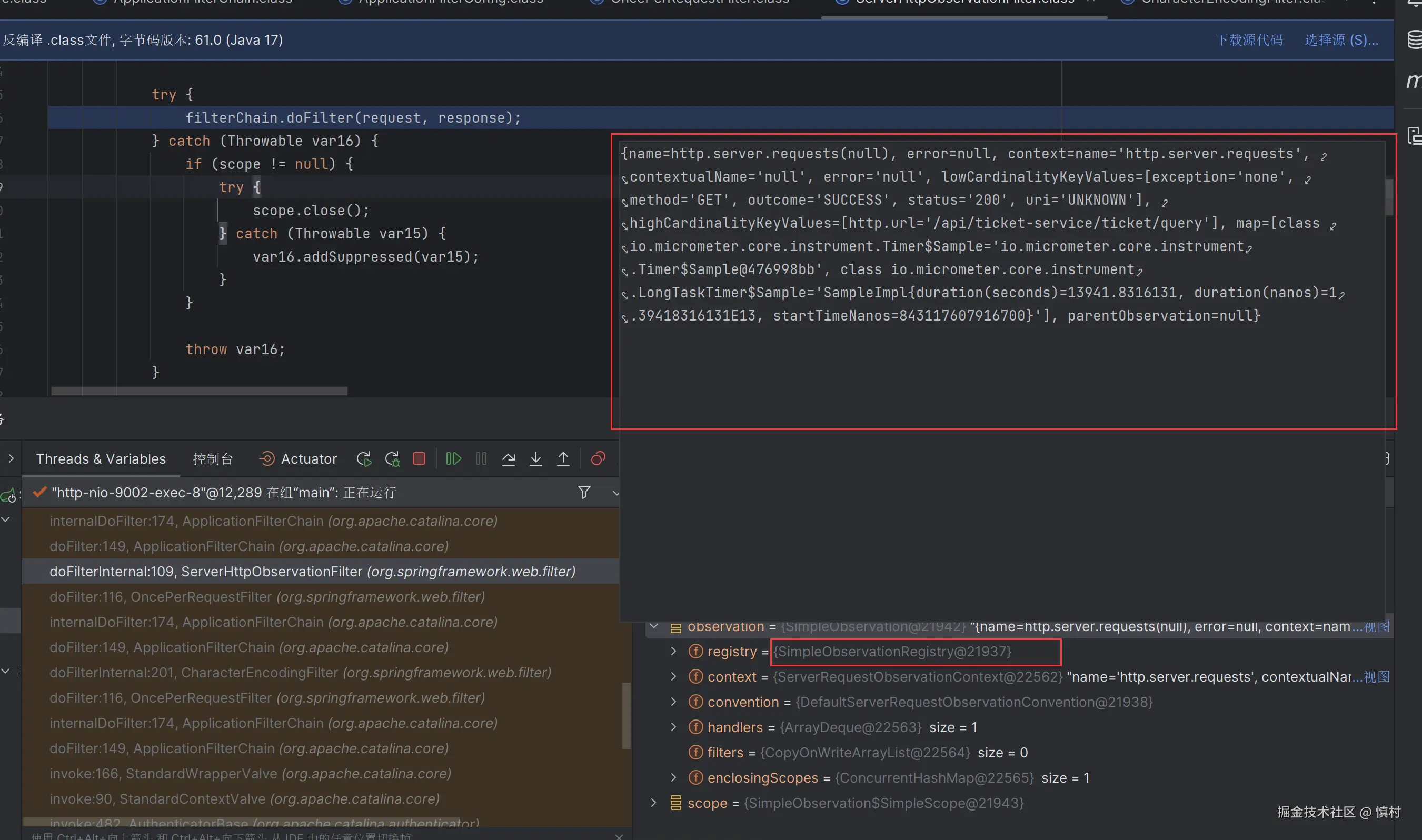 在此可以看到,线程命名为9002,是ticket接口的部分,调用了tomcat的线程池处理任务。tomcat的池子默认大小为10,核心线程数为10,最大线程数为200,ctl为RUNNING