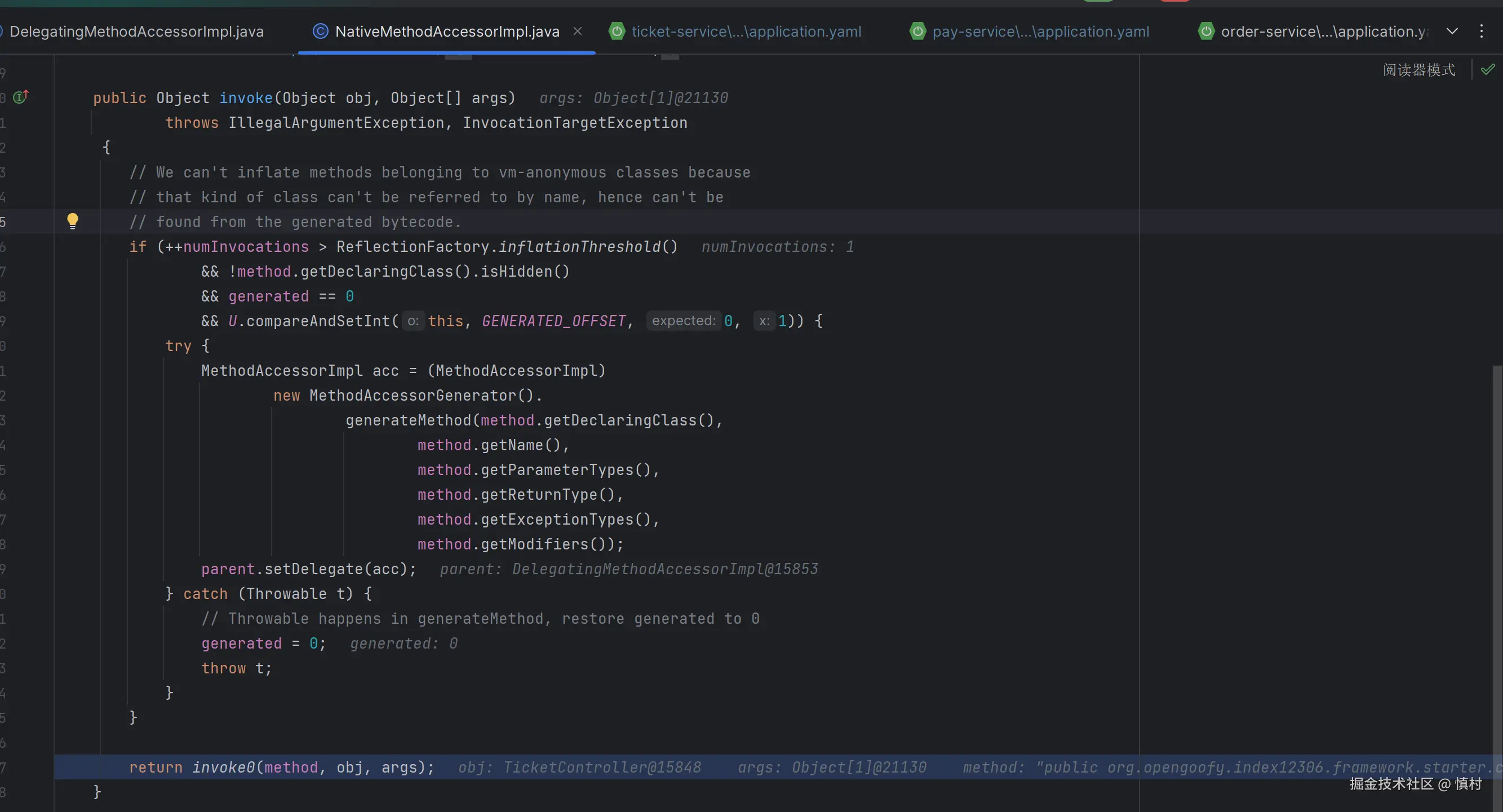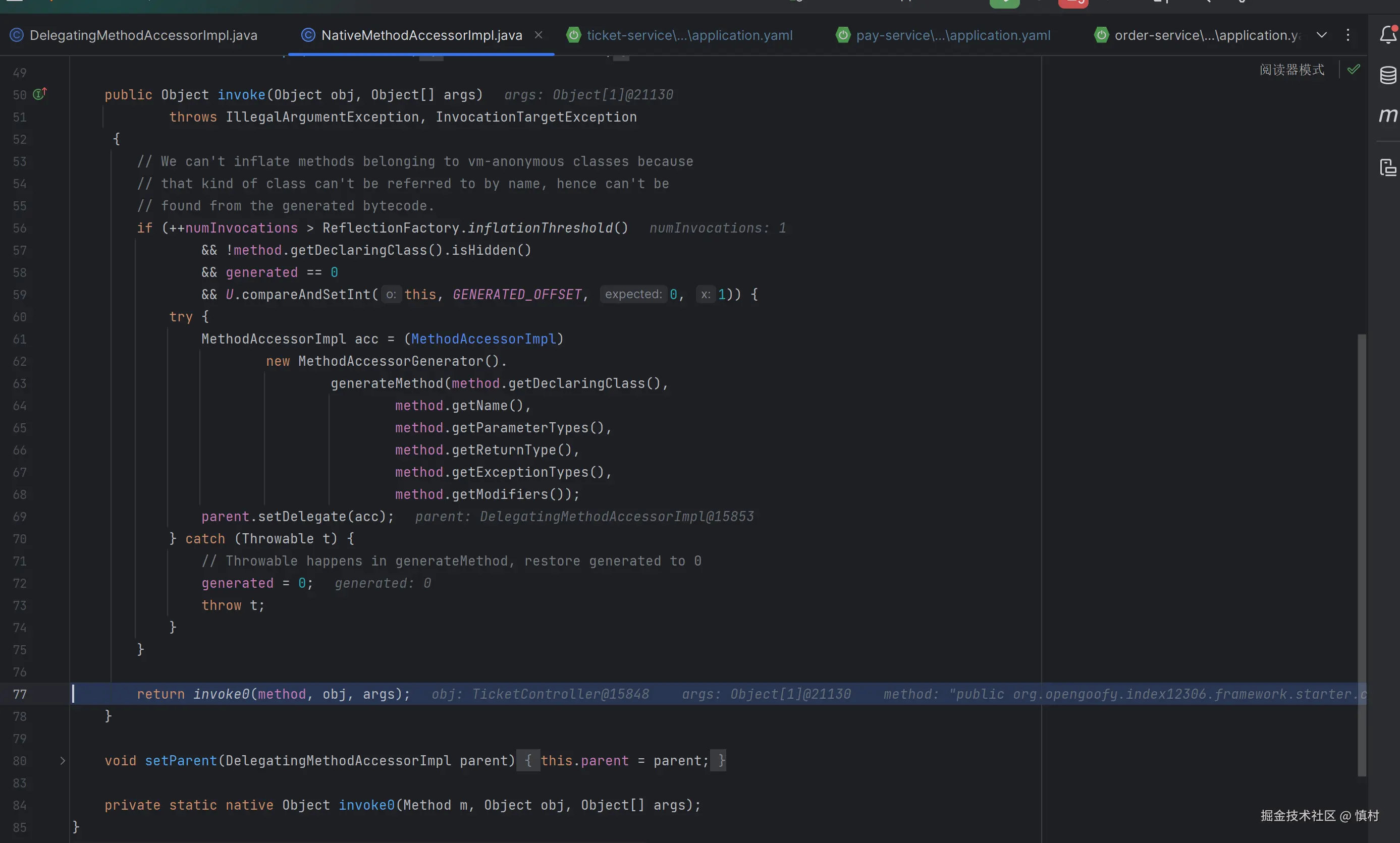 NativeMethodAccessorImpl,然后根据调用次数可能切换到GeneratedMethodAccessorXXX。这个切换过程是由DelegatingMethodAccessorImpl管理的,它是一个代理类,负责在NativeMethodAccessorImpl和GeneratedMethodAccessorXXX之间进行切换。