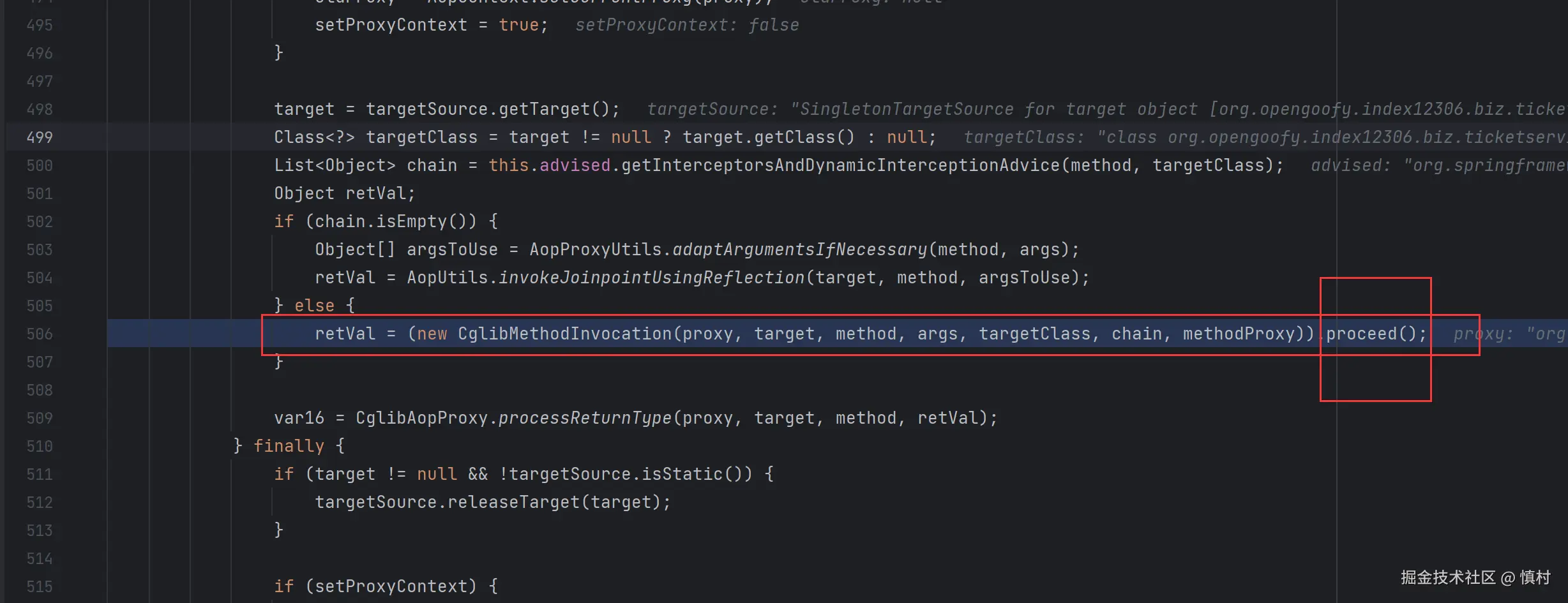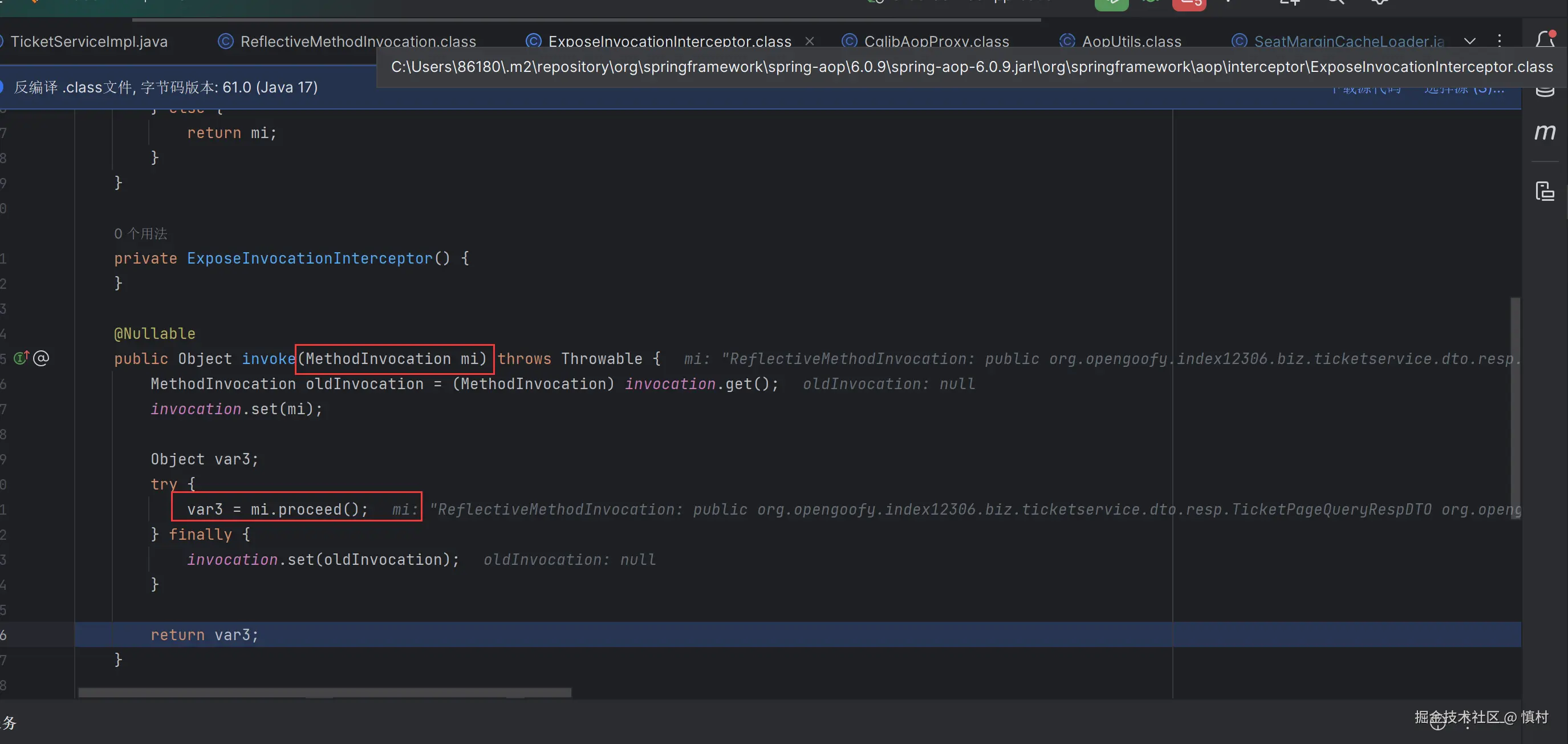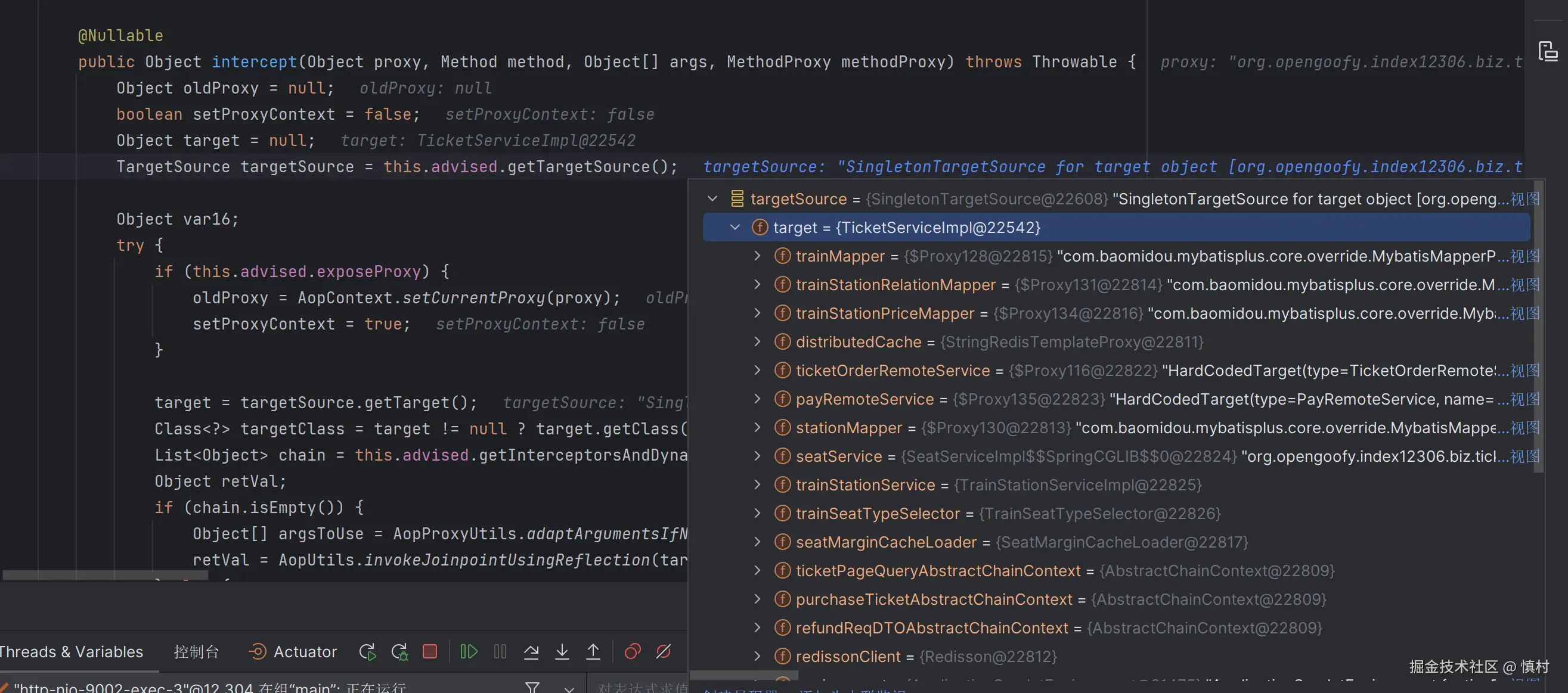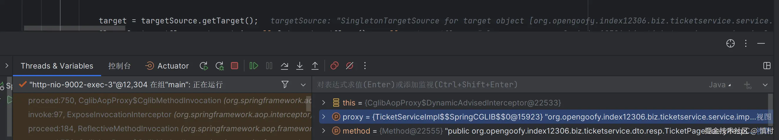 可以看到执行了mi(ticketServiceImpl).proceed方法