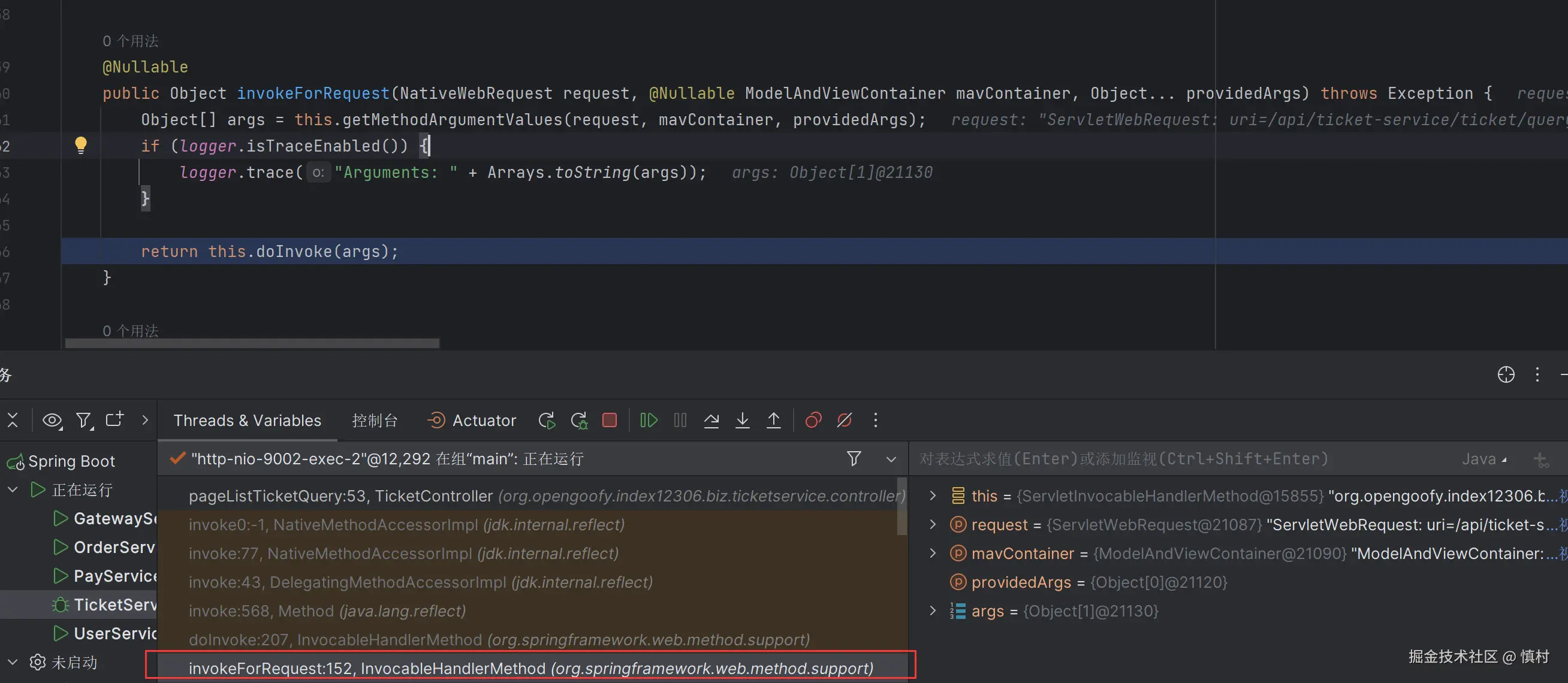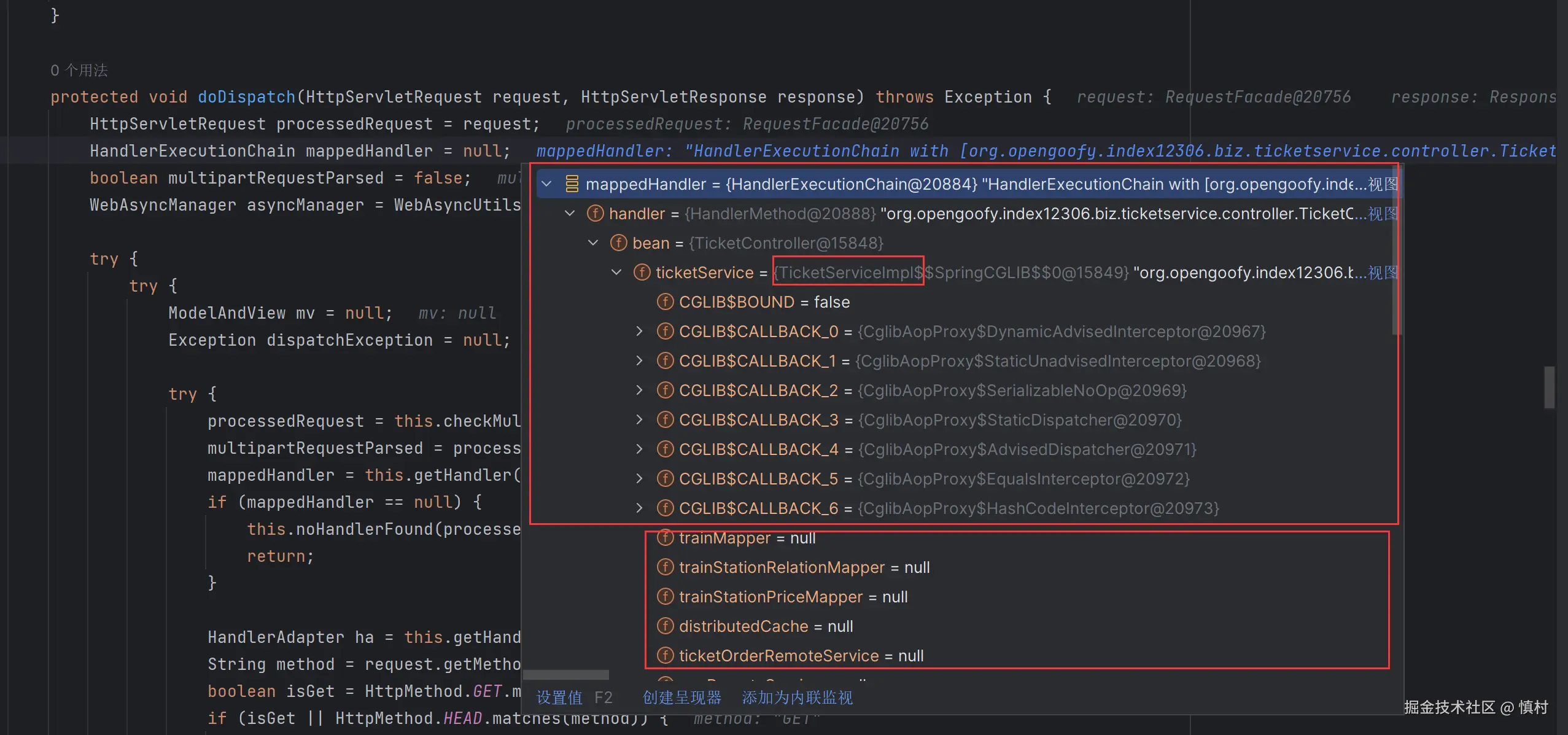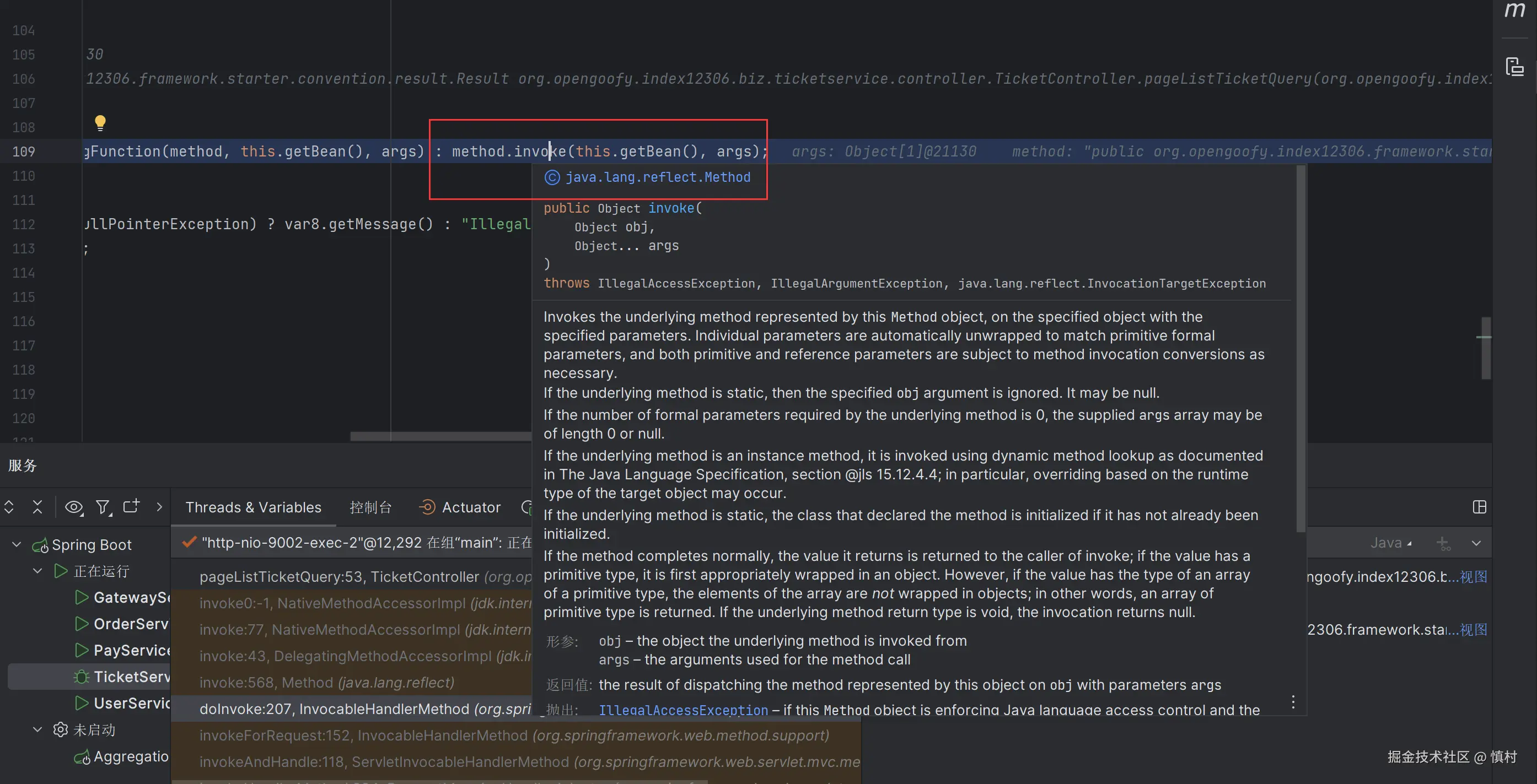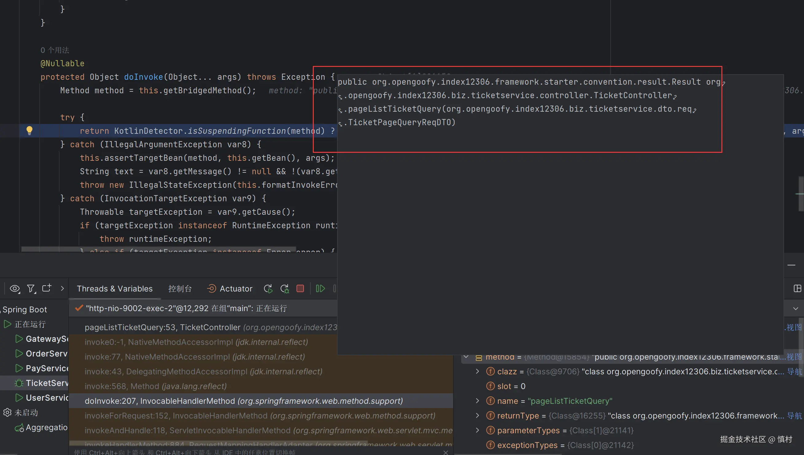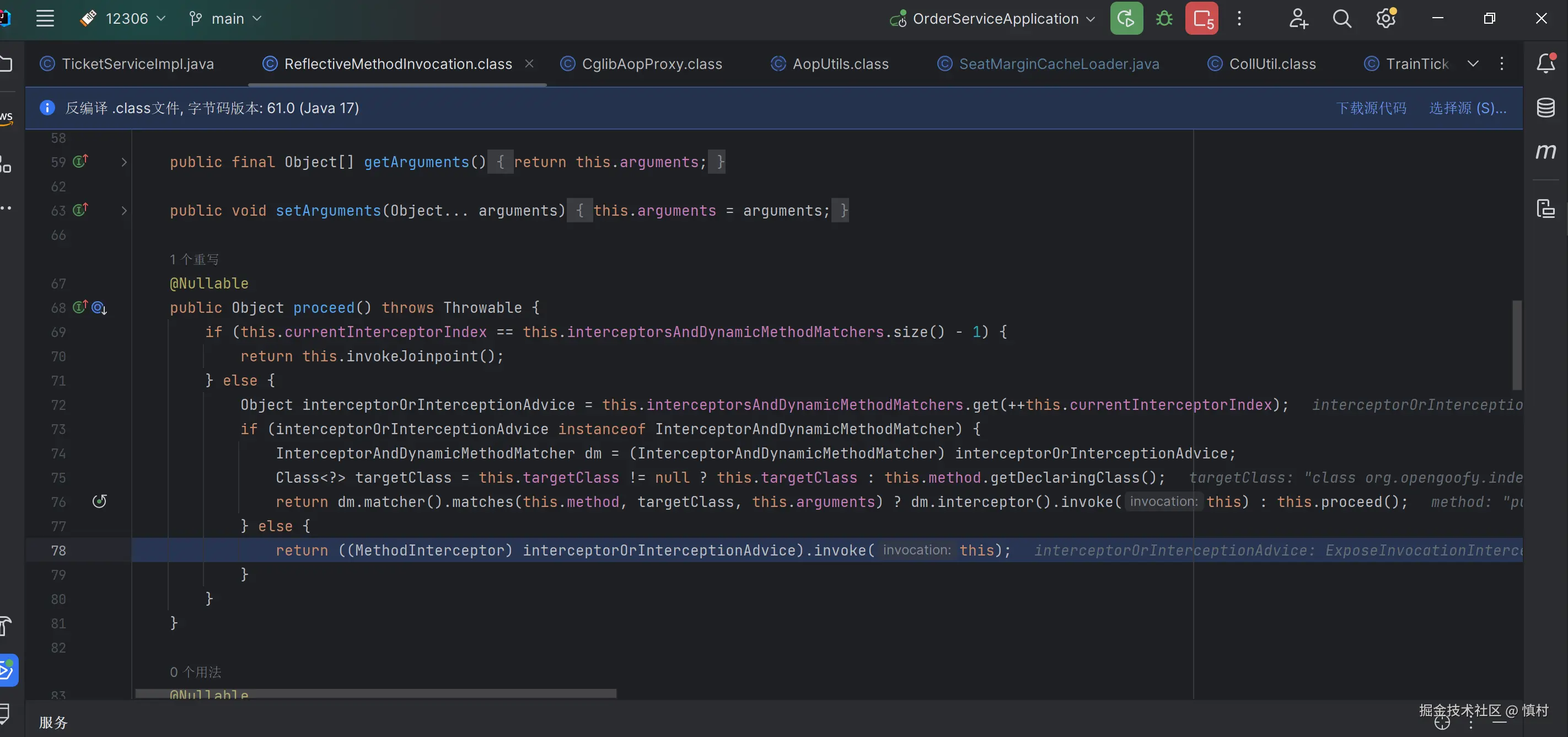 可以看到执行了mi(ticketServiceImpl).proceed方法