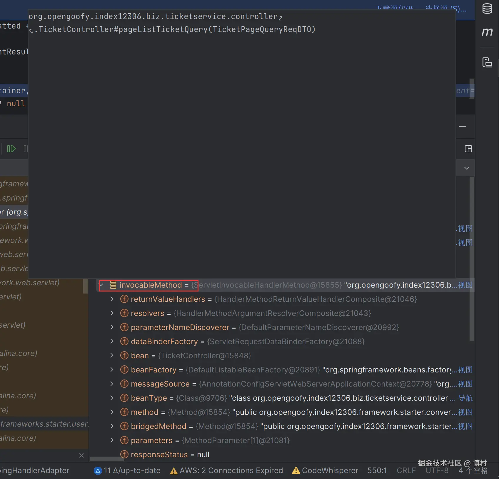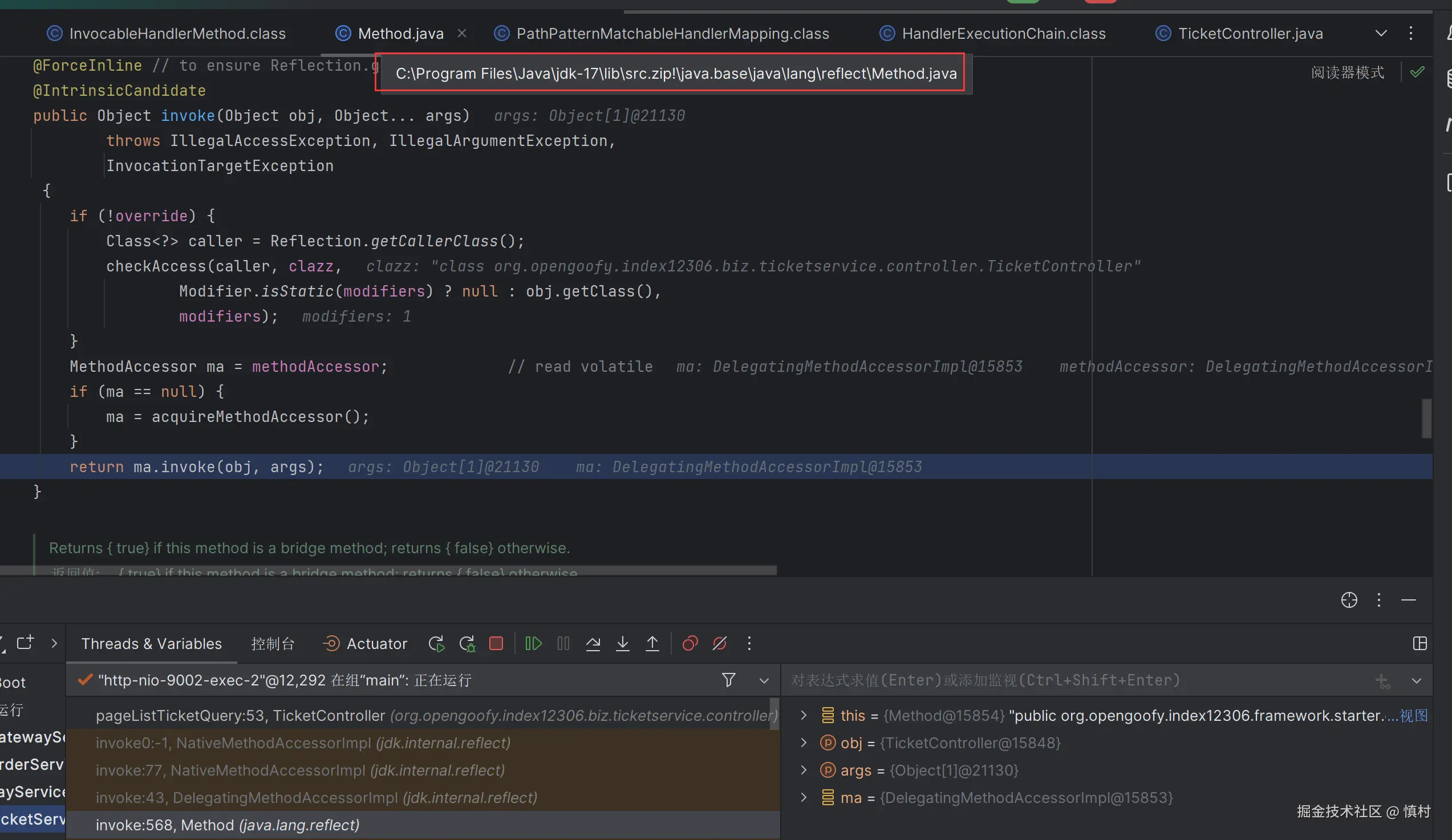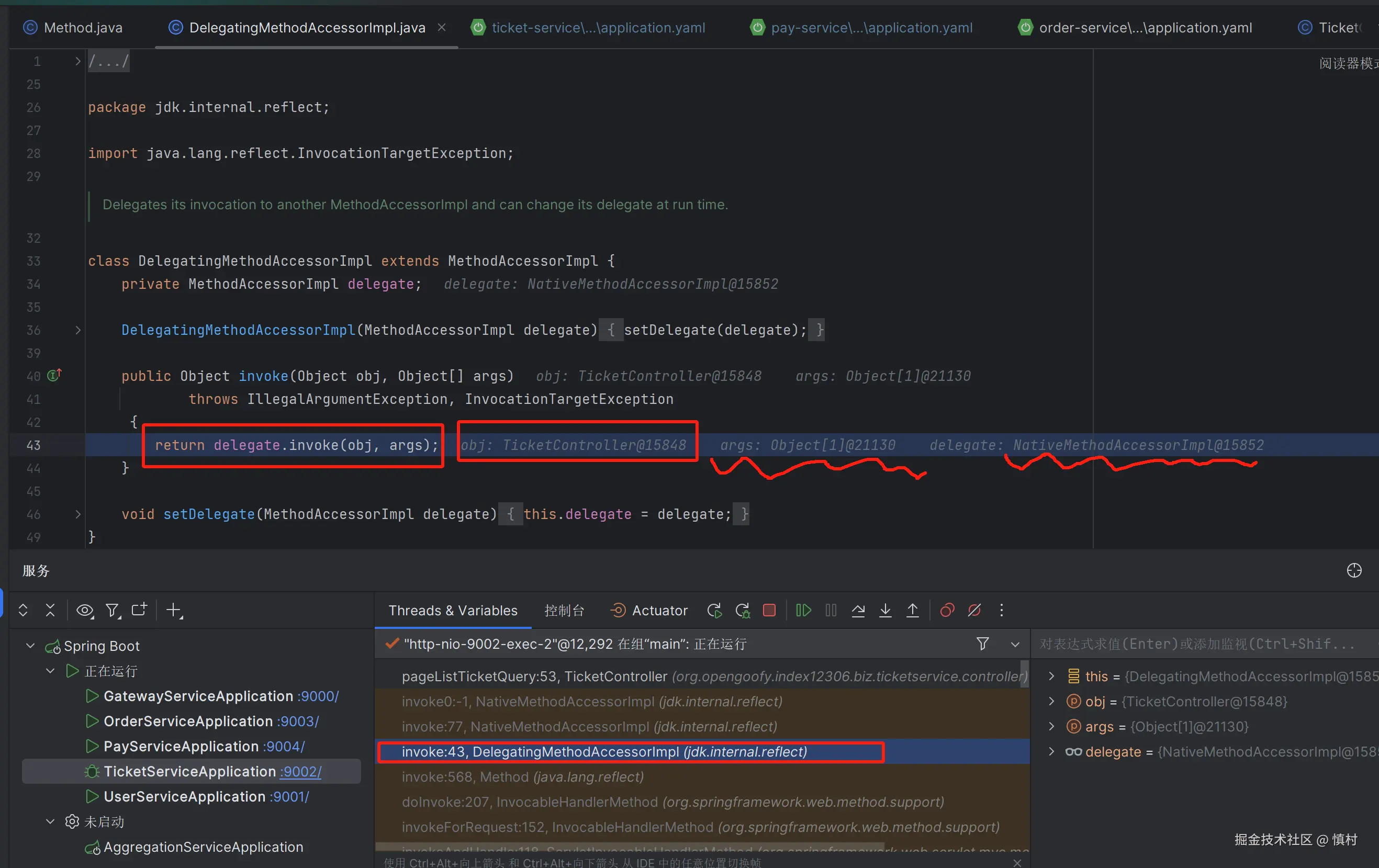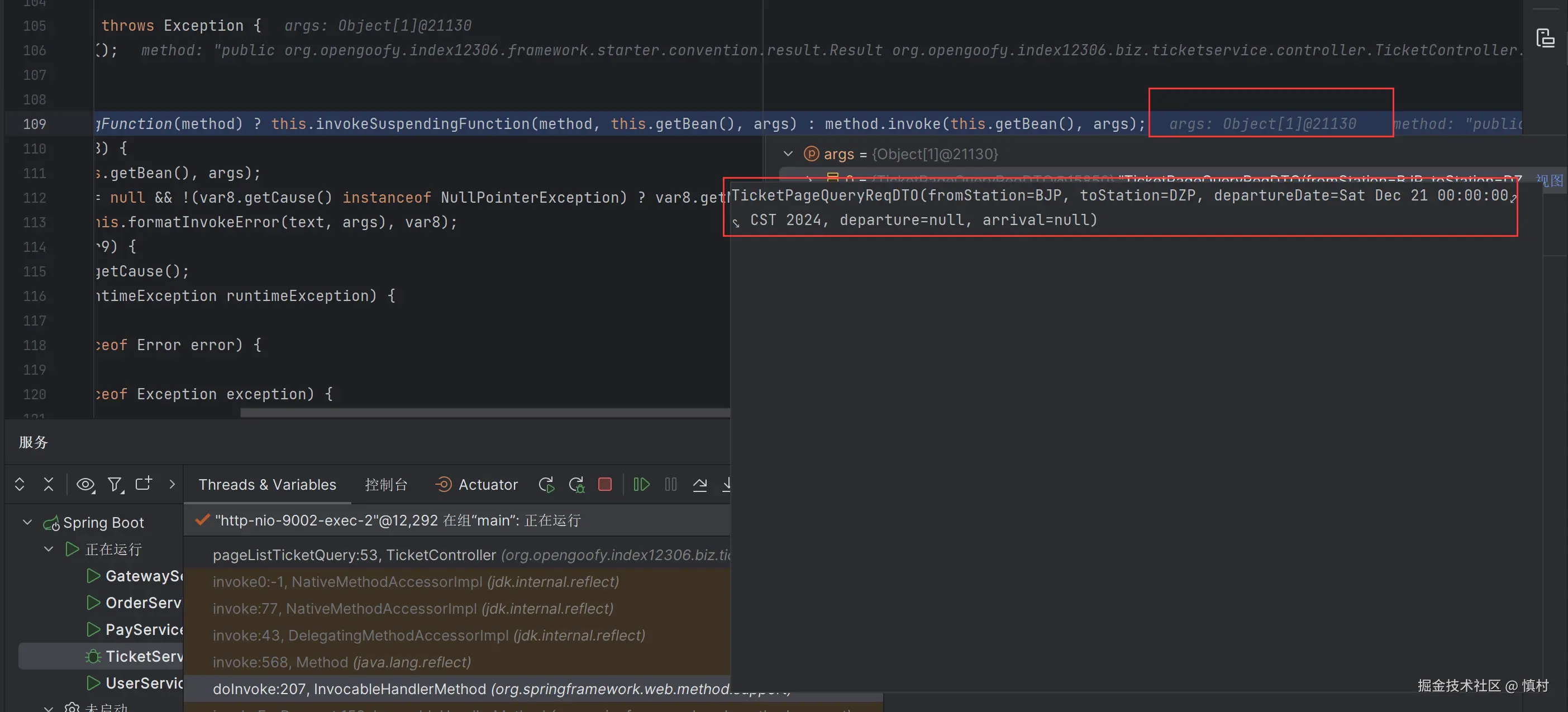 可以看到执行了mi(ticketServiceImpl).proceed方法