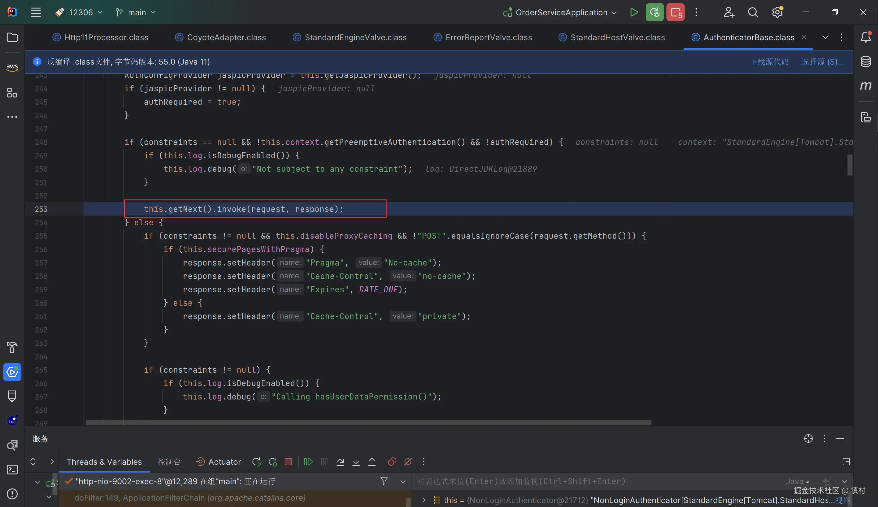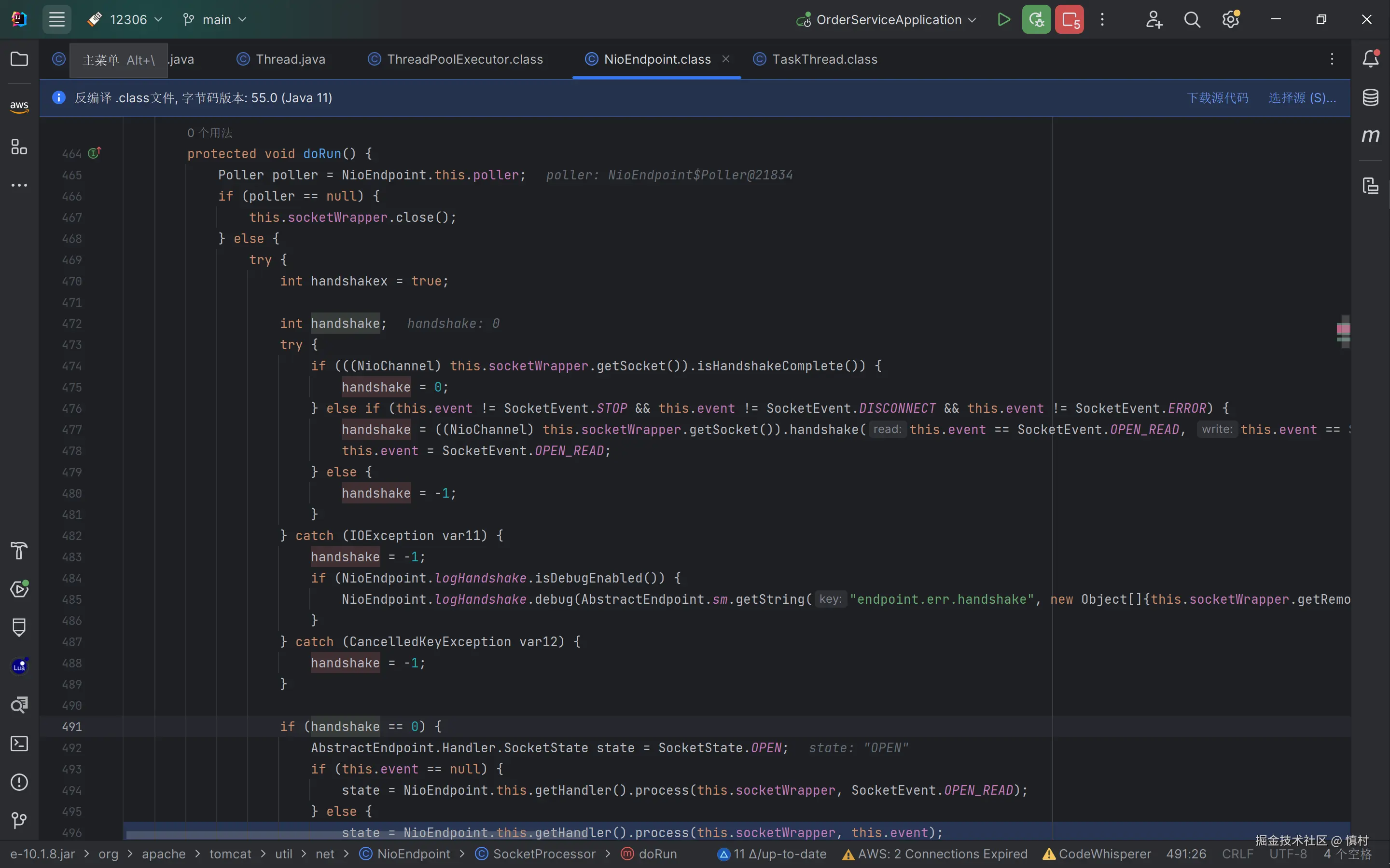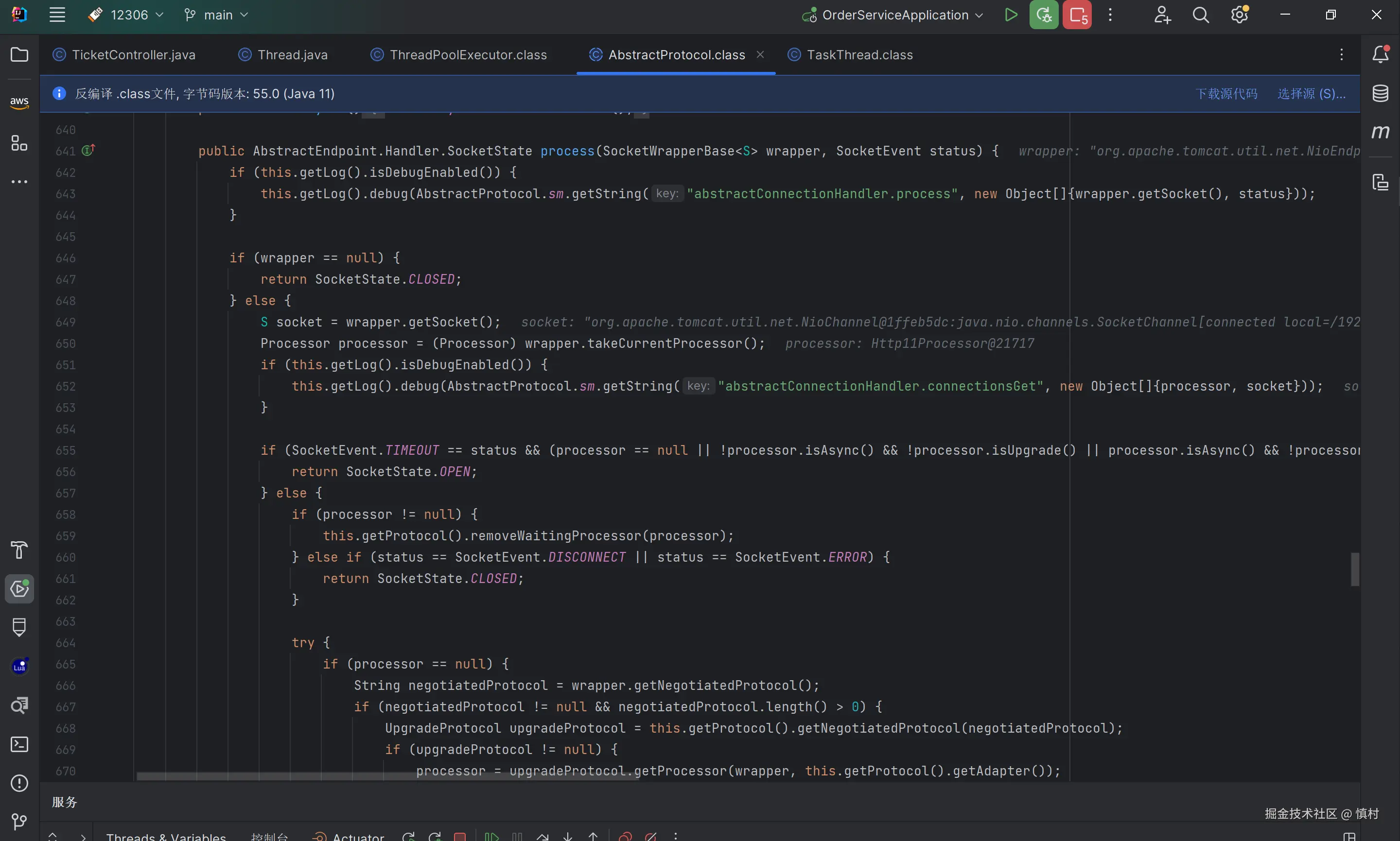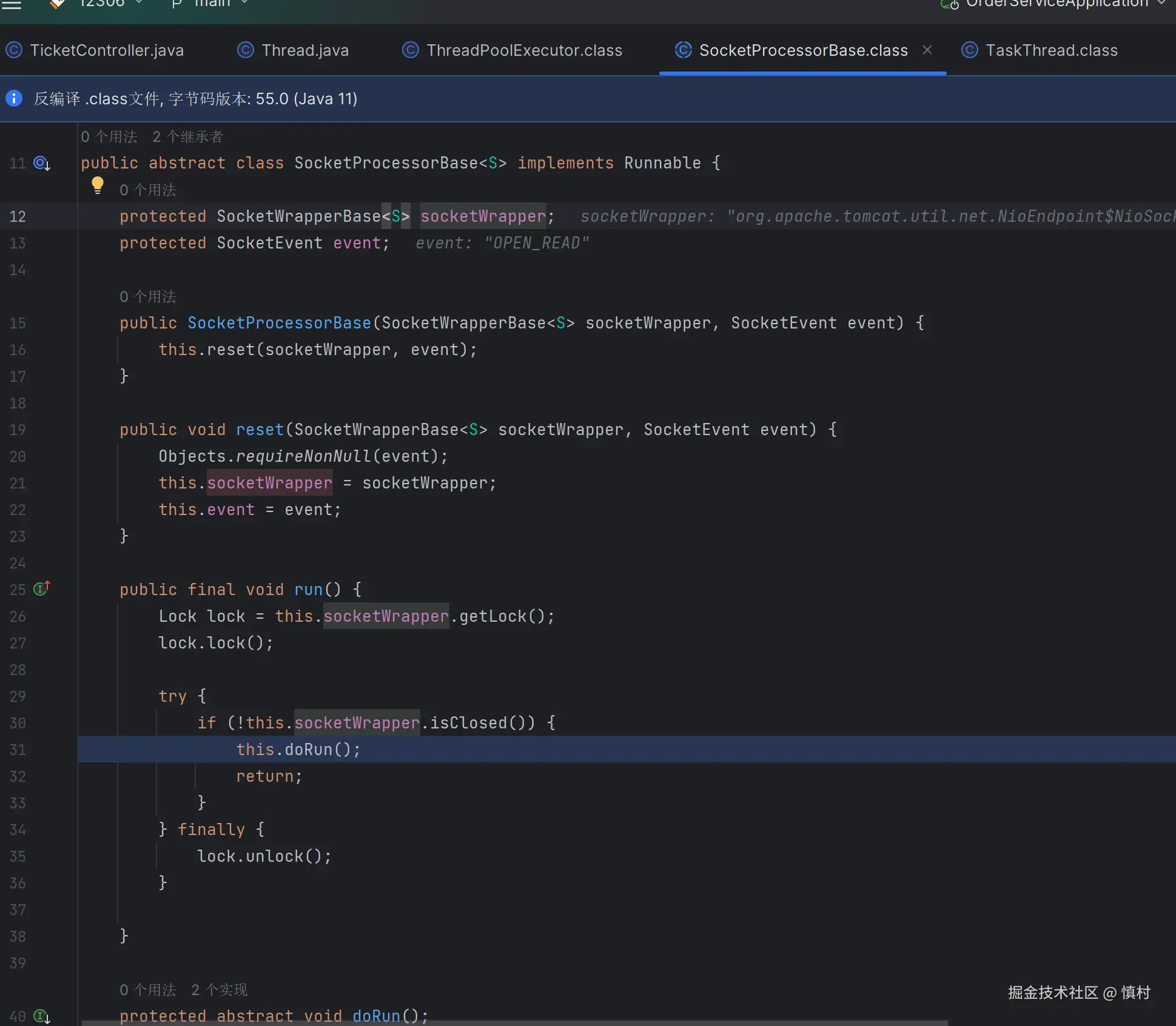 执行tomcat线程池Worker任务,进入SocketProcessorBase的方法