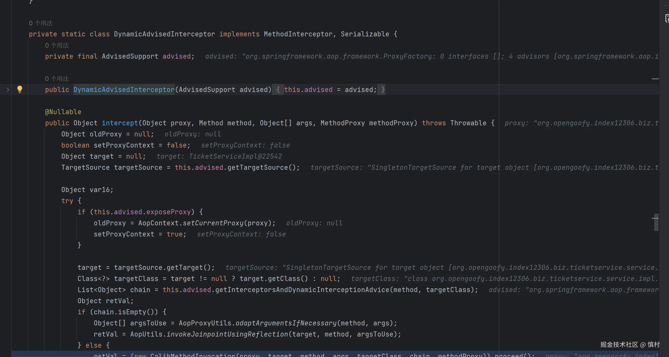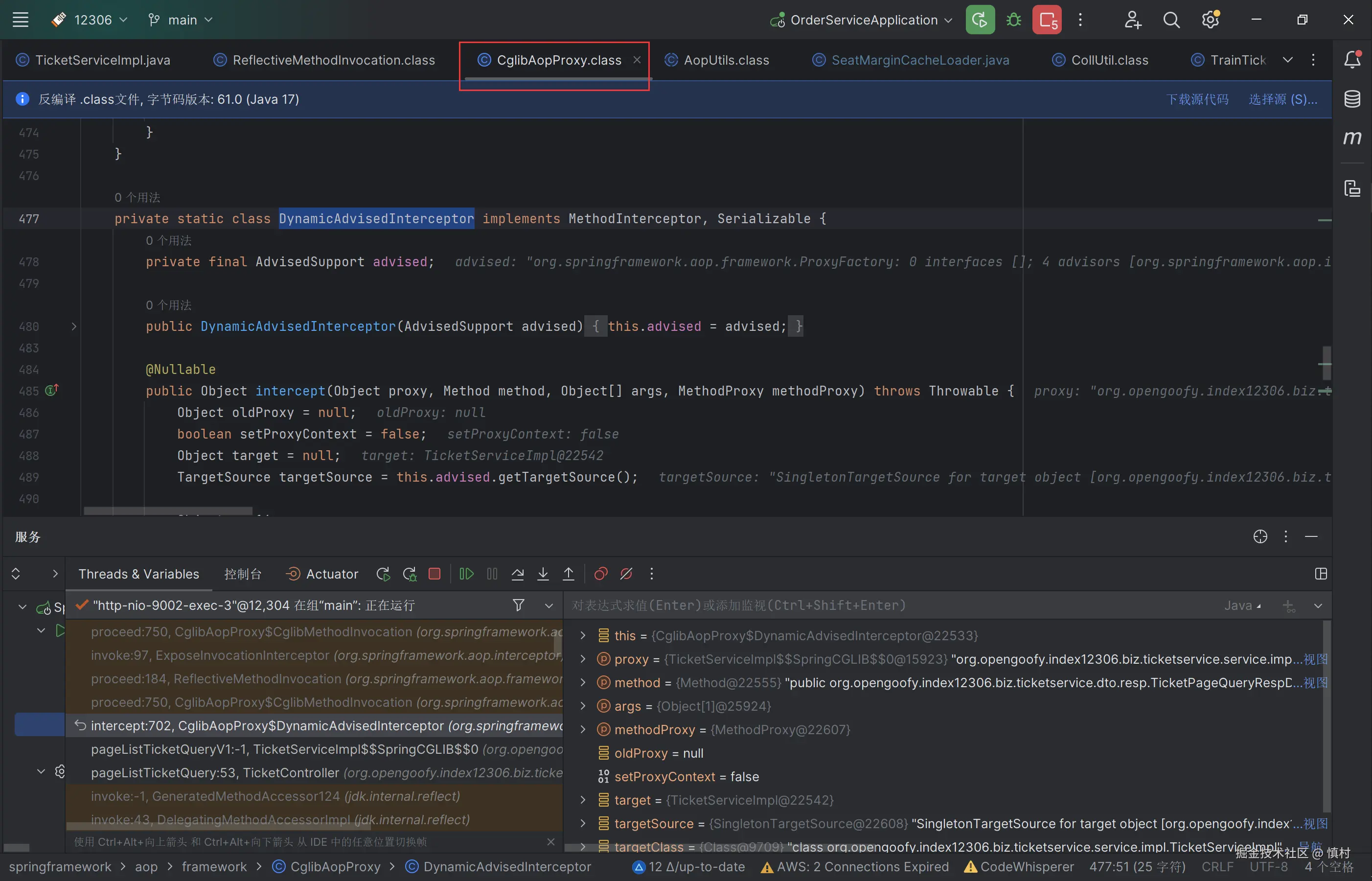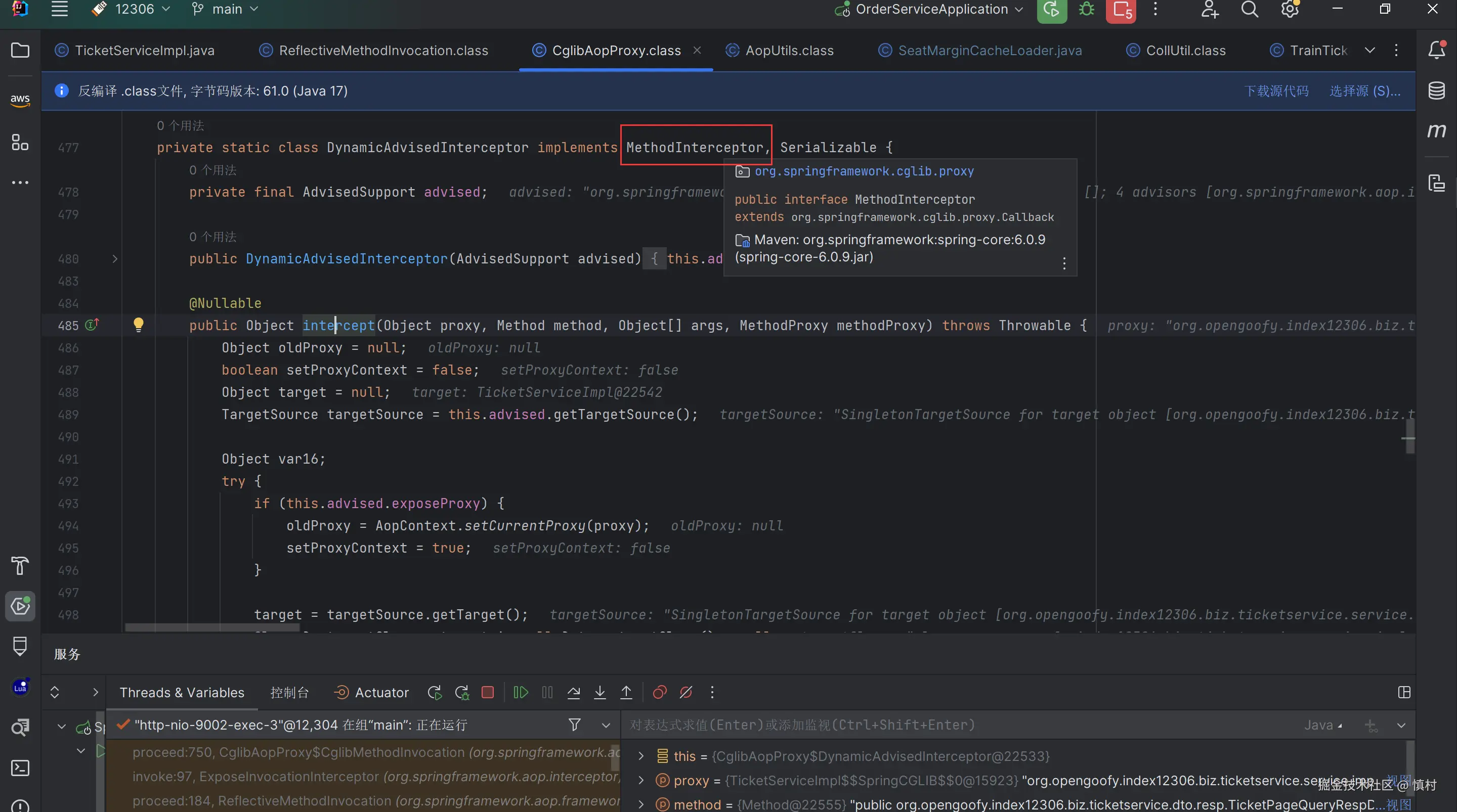 可以看到这个类实现了cglib里面的MethodInterceptor,所以Spring AOP的代理是基于cglib的动态代理,增强的目标类为ticketServiceImpl,执行方法为查询方法