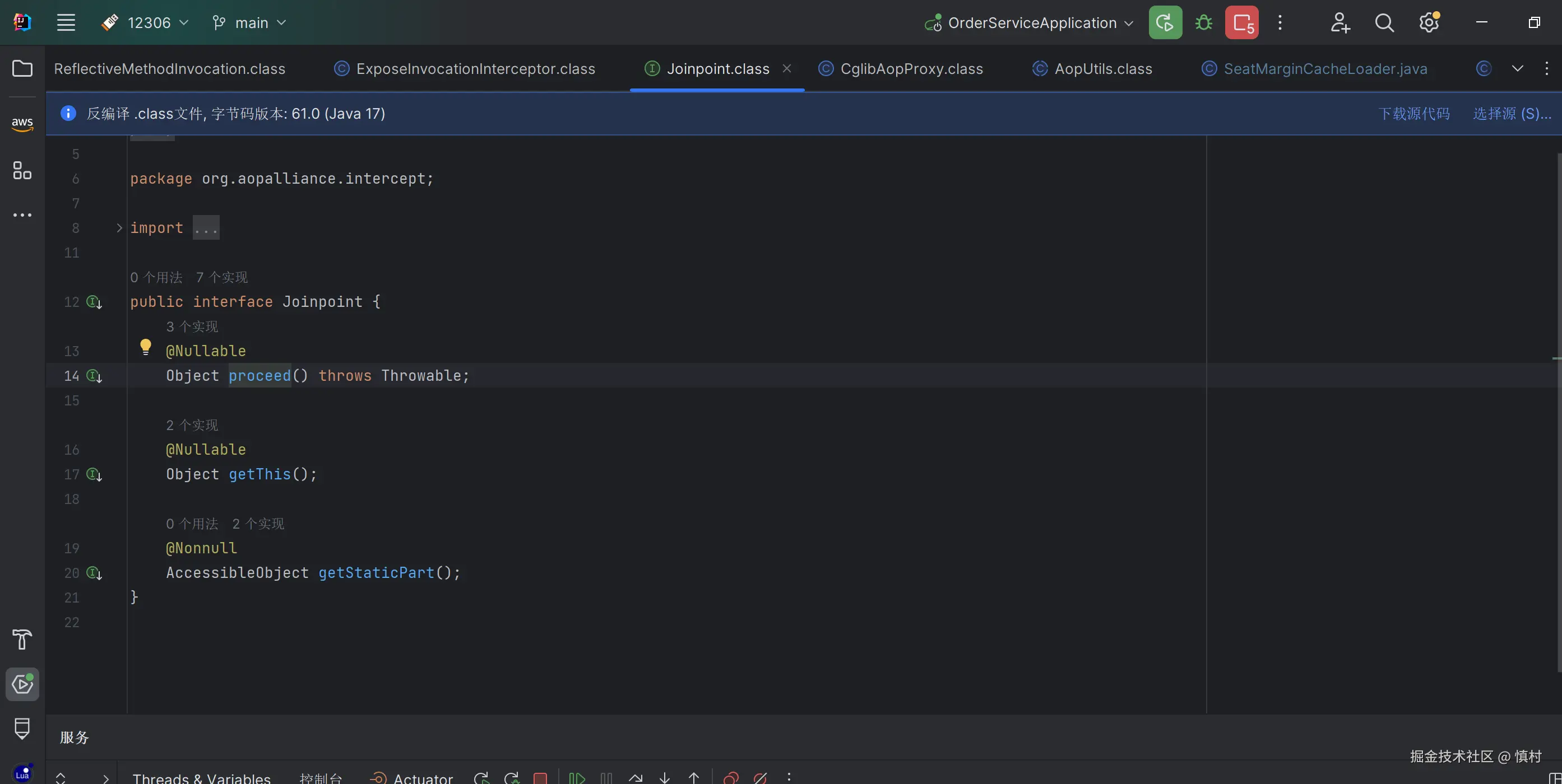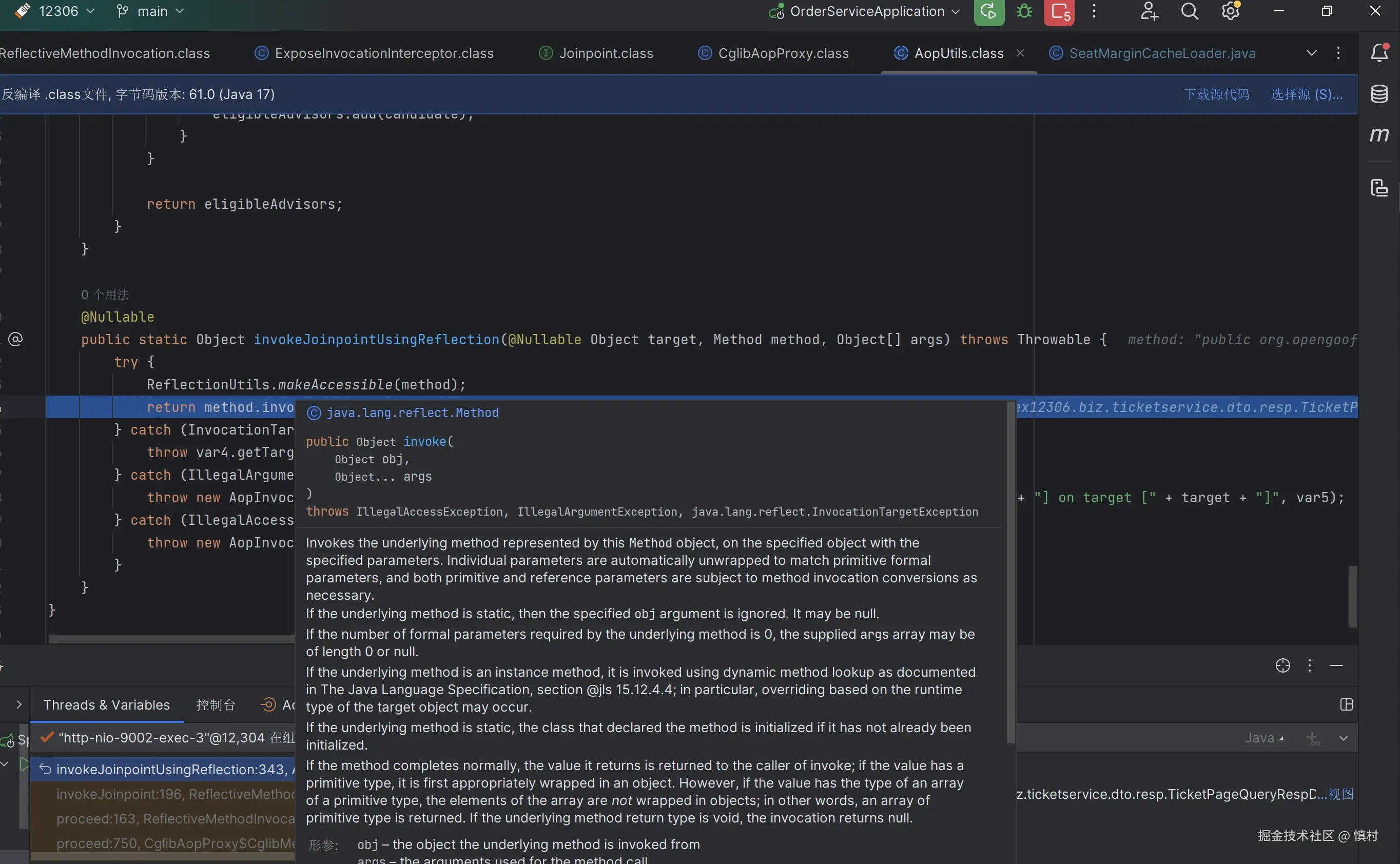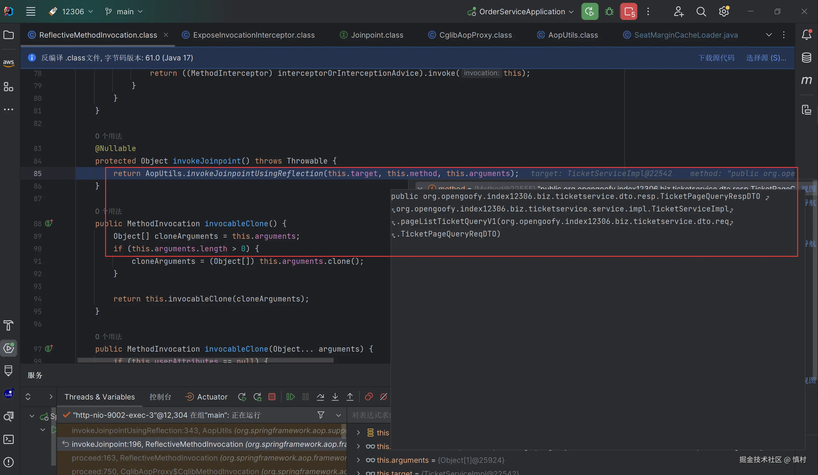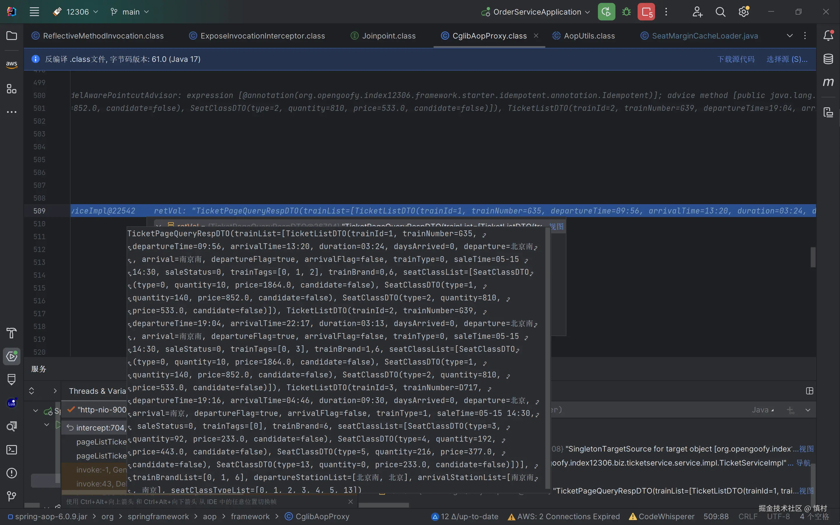 可以看到这个类实现了cglib里面的MethodInterceptor,所以Spring AOP的代理是基于cglib的动态代理,增强的目标类为ticketServiceImpl,执行方法为查询方法