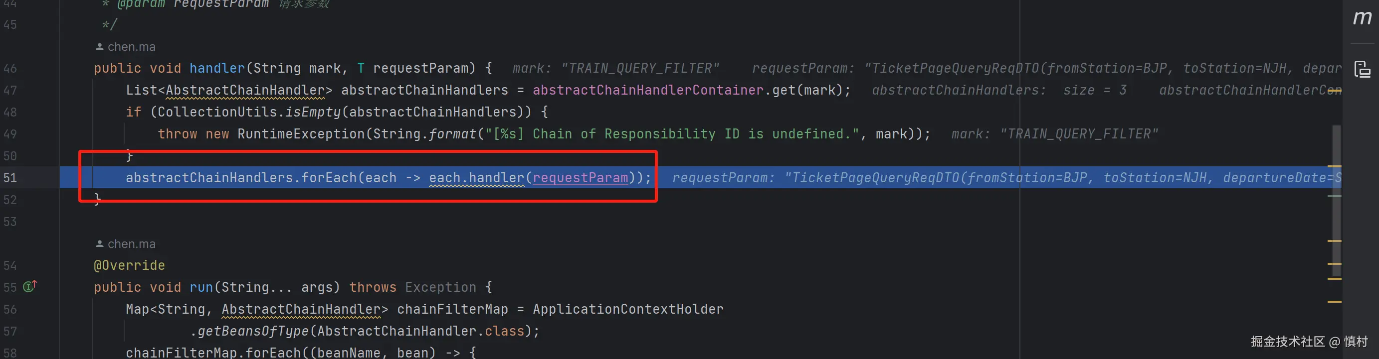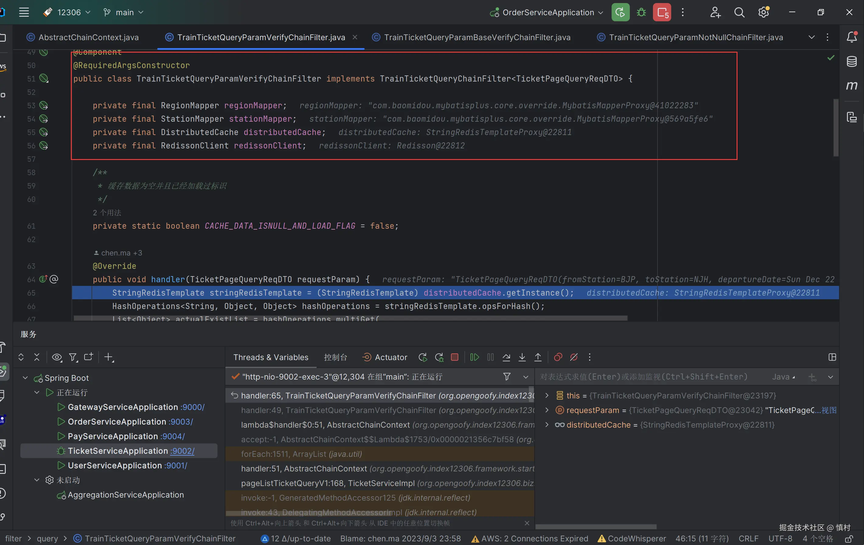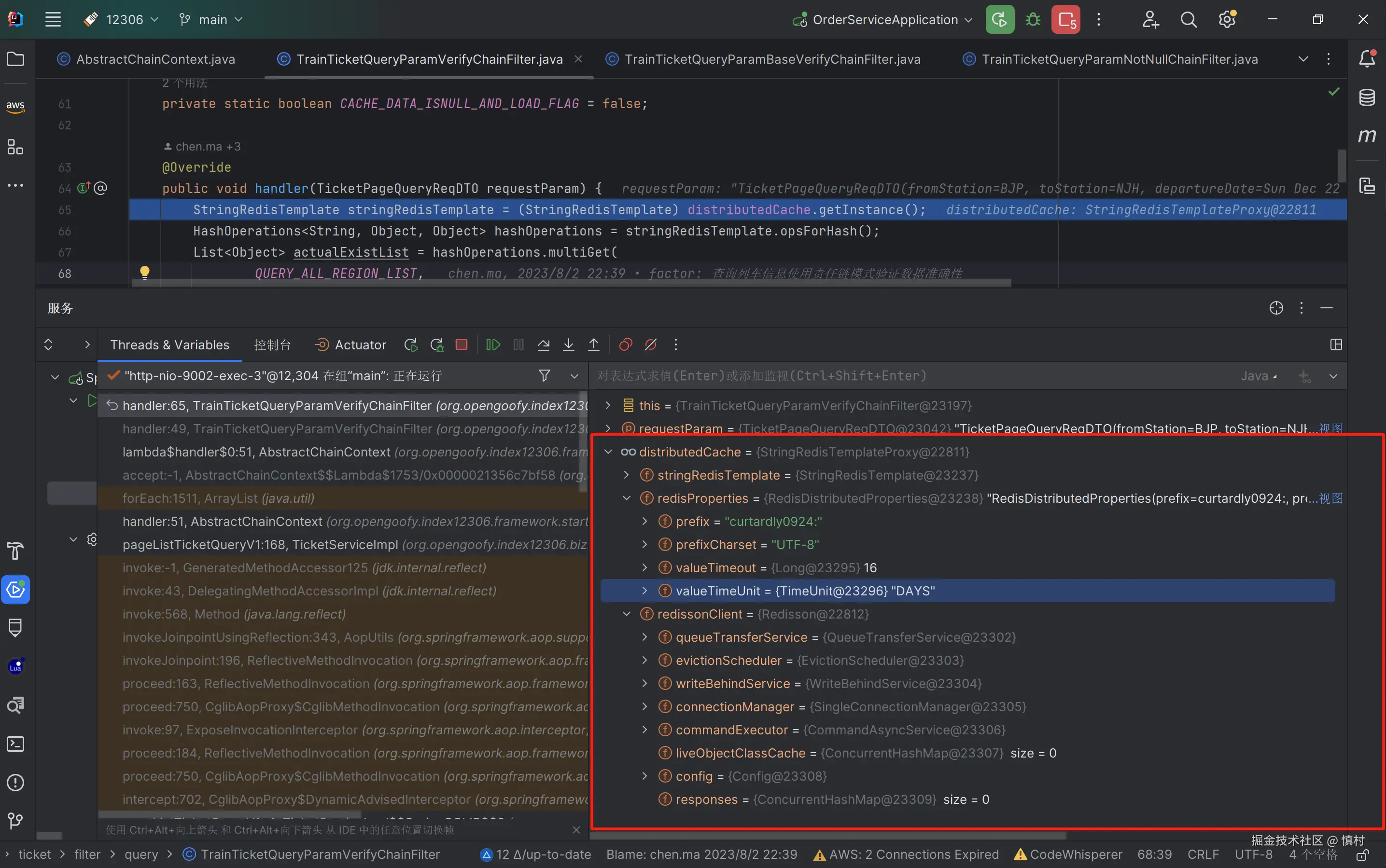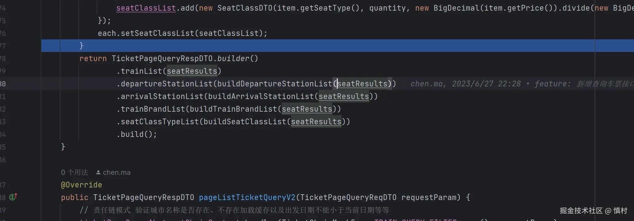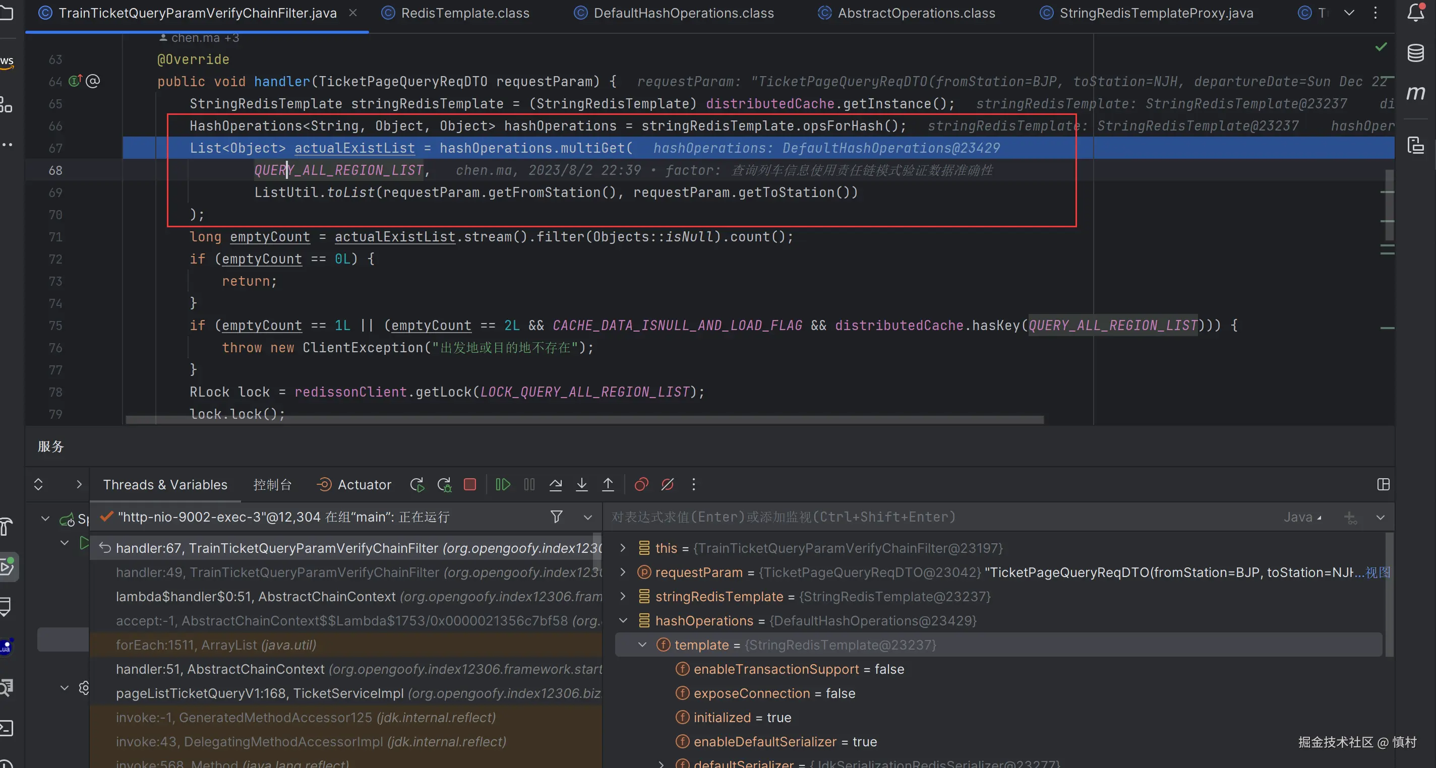 首先验证参数(参数非空责任链)是否为空,不为空则进入规则责任链(出发日期不能小于当前日期,出发地不能小于当前日期等),最后进入查询列车车票流程过滤器,验证数据是否正确。如果缓存有数据,我们就去缓存中获取数据查询结果,否则上分布式锁和双重判定去数据库里查询数据,最后将数据回写到缓存中去