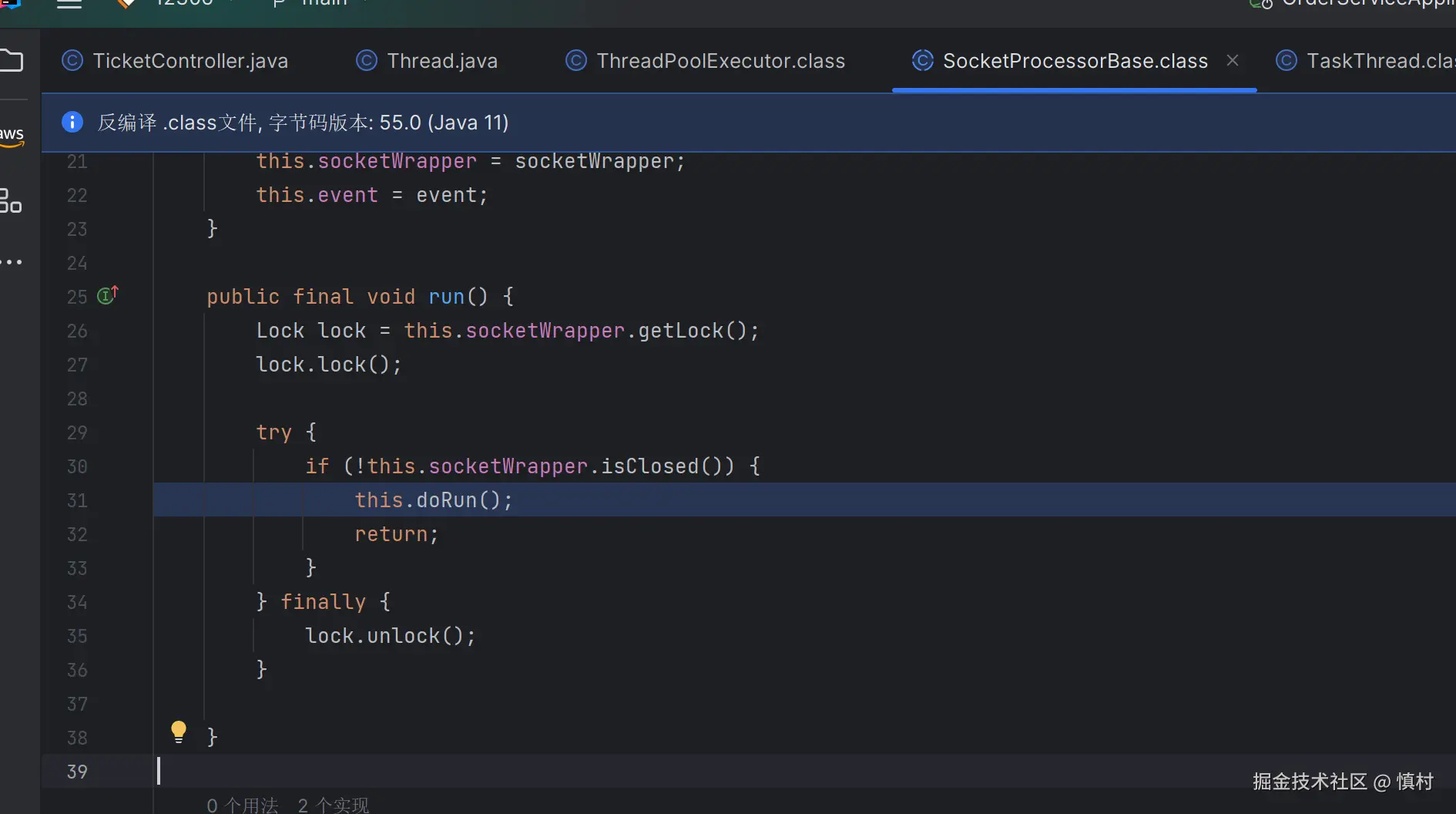 finally {:无论doRun方法是否成功执行,或者是否发生异常,finally块总是会被执行。lock.unlock();:在finally块中,调用锁的unlock方法来释放锁。这是非常重要的,因为它允许其他等待锁的线程继续执行。