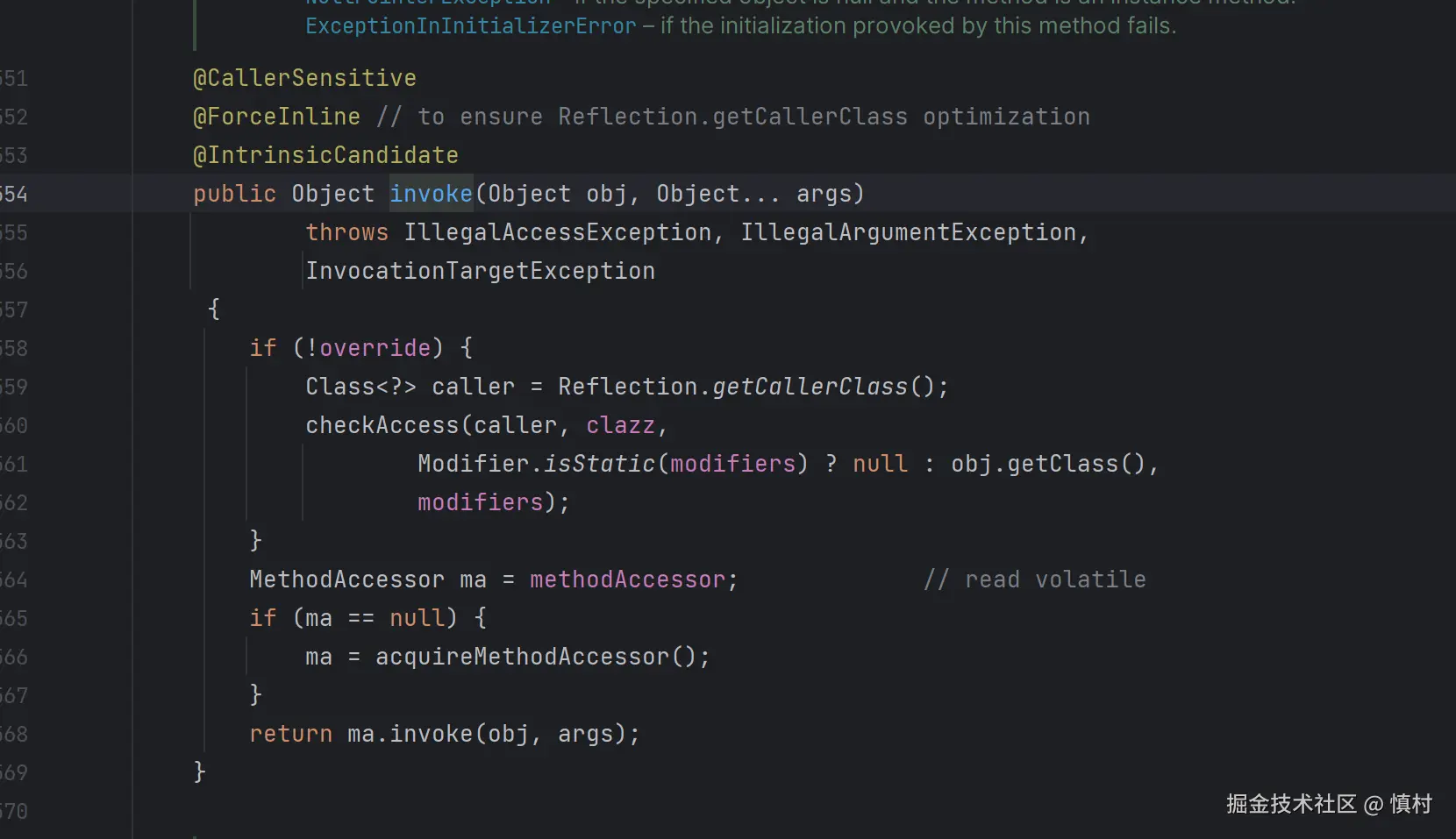 这段代码是 NativeMethodAccessorImpl 类中的 invoke 方法的实现,它是 java.lang.reflect 包的一部分。这个方法是 MethodAccessor 接口的核心,用于通过反射调用 Java 方法。以下是对这段代码的详细解释: