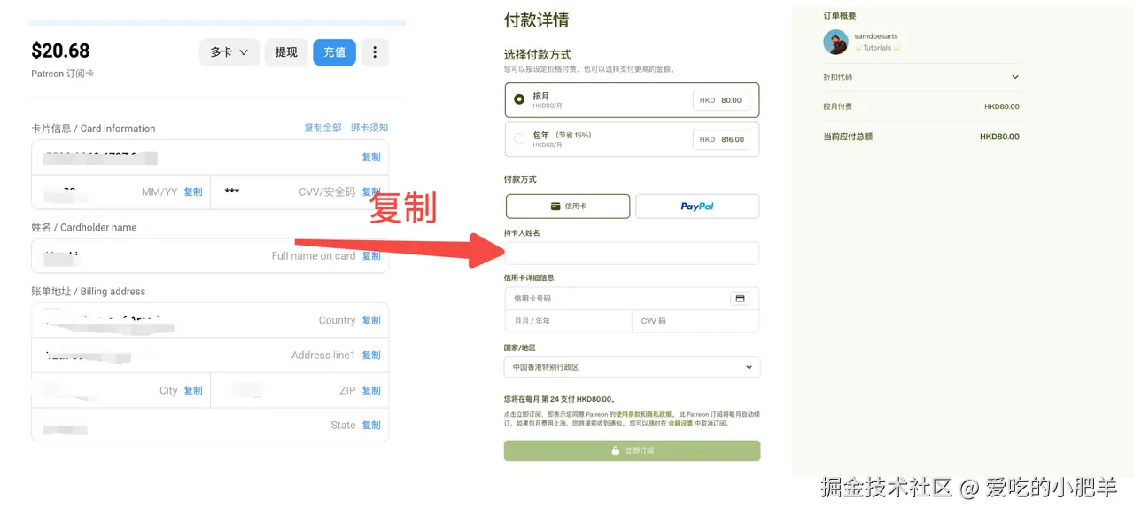 整体的开卡流程还是很简单。卡片开通后就直接到了最后一步,订阅Patreon上的博主,把卡片上的信息填写到订阅页面就可以。 就像下面这样——