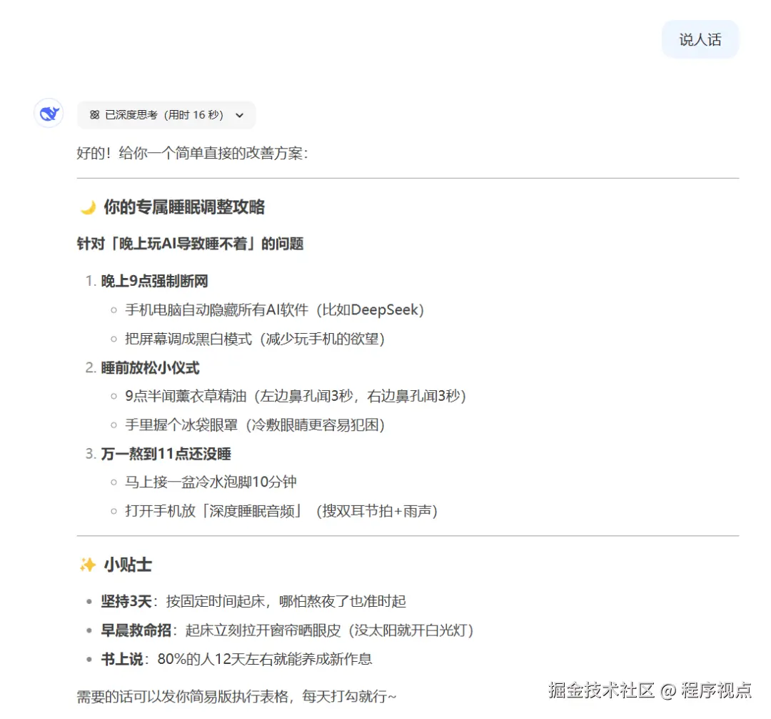 但,这种情况是可以避免的,只需要一个小技巧,就是“深度思考”模式不能一开始就打开。要先用普通模式聊几轮,让它“学会”用正常语言交流。再切换到“深度思考”模式,就能有效避免这个问题了。