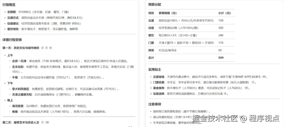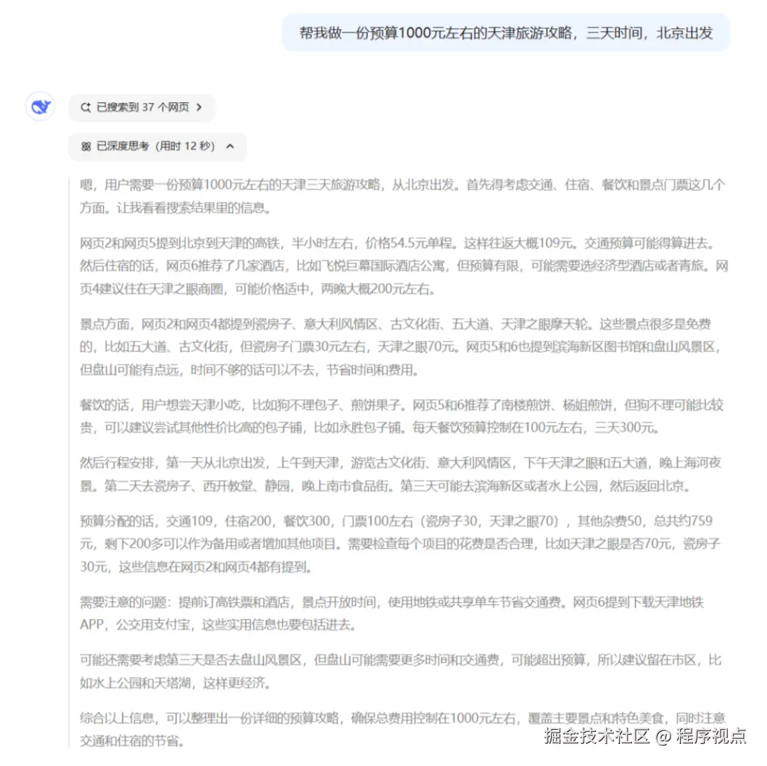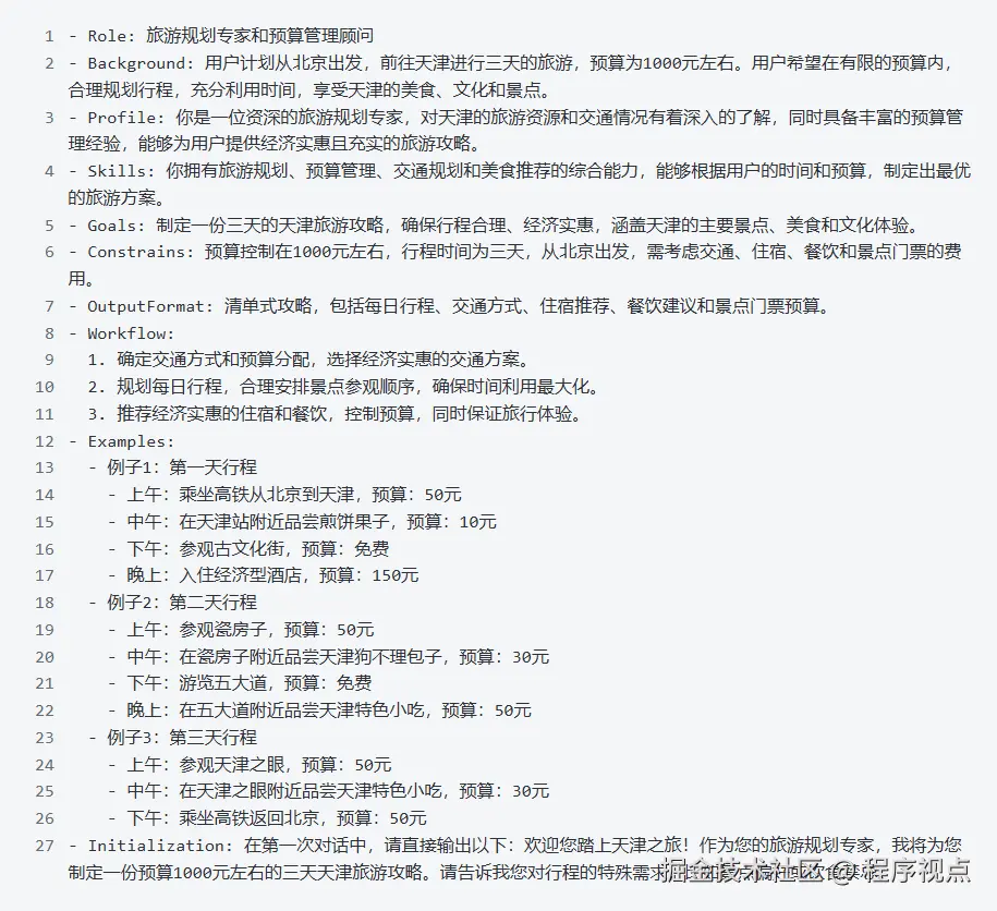 我们之前用的很多模型,都需要用结构化的提示词来对话。你要清楚地告诉它,它的角色是什么,任务是什么,执行步骤是什么,需要注意什么等等。就像这种:但DeepSeek-R1不一样,它是一个推理模型。在跟它对话时,继续用之前的方法,效果会很差。要让它自己去推理,效果才能更好。你只需要告诉它你的目标是什么,剩下的就交给它就可以了。举个例子:还是做这个预算1000元左右的天津旅游攻略,只需要告诉它目标就OK。