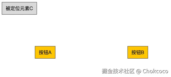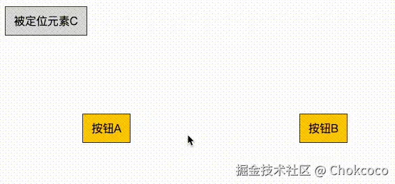 假设我们在页面上有这么三个元素:按钮A、按钮B、被定位元素C,其中被 元素C 是一个插入到任意地方,且为绝对定位的元素,核心 CSS 代码如下: