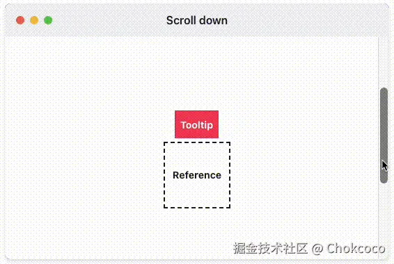 我们以一个功能比较强大的 Popover 库 floating-ui 举例,其官网展示了如下的一个功能,当元素在滚动过程中,如果原本 Popover 弹窗被遮挡,会自动进行位置移动,将弹窗重新调整到可视区域,效果如下: