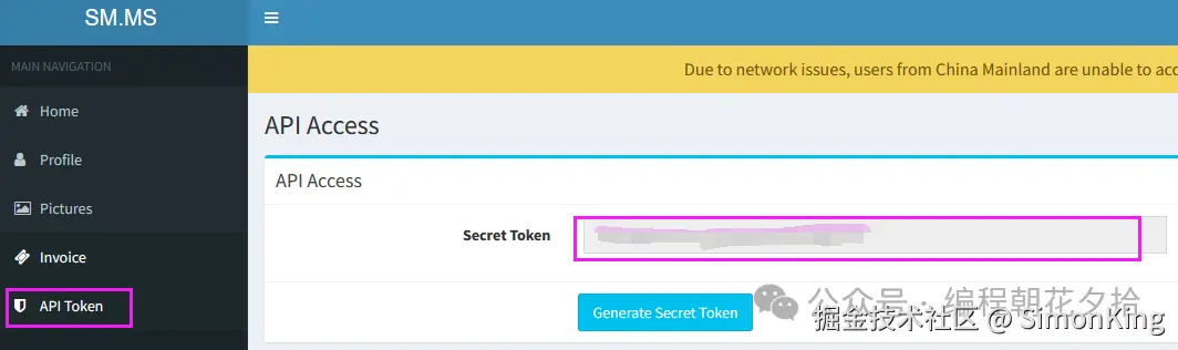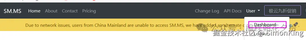 申请账号登录进去,进入Dashboard可以获取api token。这个是PicGo配置SM.MS图床的关键信息。