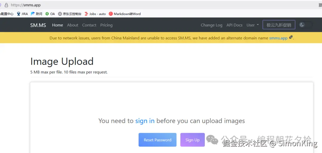 笔者采用的图床是SM.SM,官网地址:smms.app。因为配置简单,主要是免费。我们只需要注册一个SM.MS账号即可。