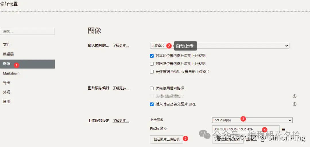 打开Typora,在file>偏好设置>图像里面设置。然后安装①②③④⑤以此点击配置。