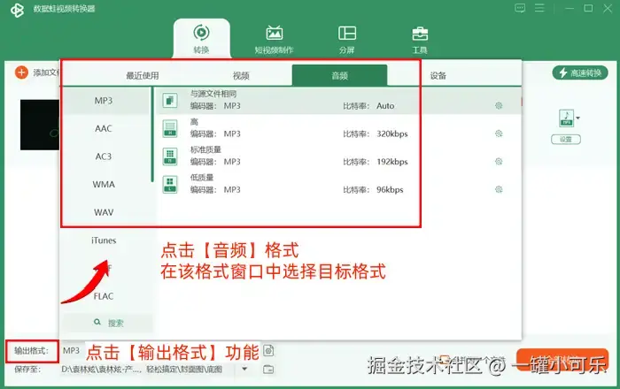 步骤2:点击格式转换下方的【输出格式】功能,点击【音频】格式,在该格式窗口中选择目标格式。