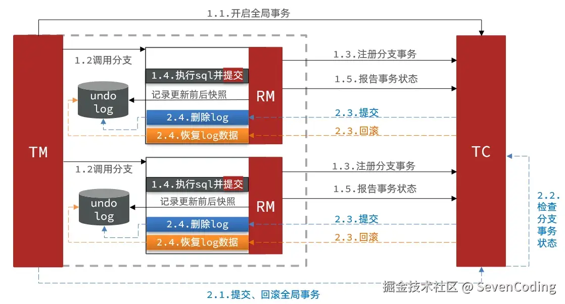 - TC (Transaction Coordinator) - 事务协调者:维护全局和分支事务的状态,驱动全局事务提交或回滚。