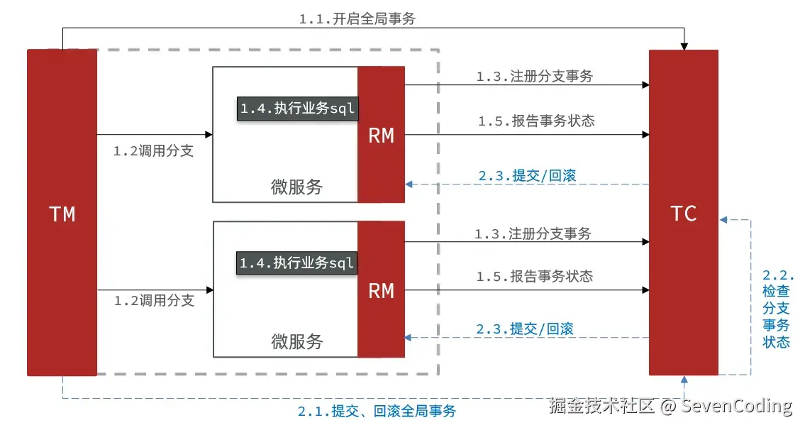 - TM (Transaction Manager) - 事务管理器:定义全局事务的范围,开始全局事务、提交或回滚全局事务。