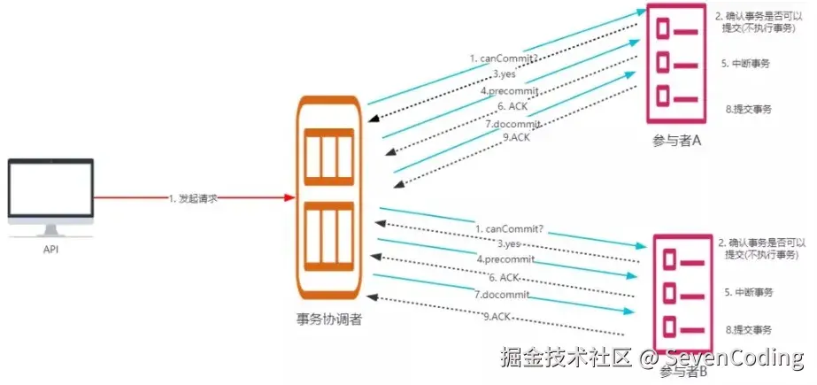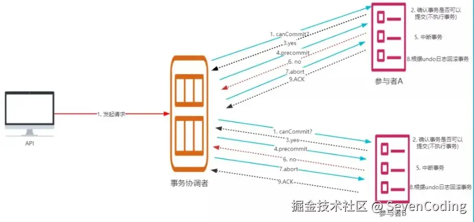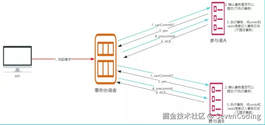 协调者向参与者发送 canCommit 请求,参与者如果可以提交就返回Yes响应,否则返回No响应,具体流程如下: