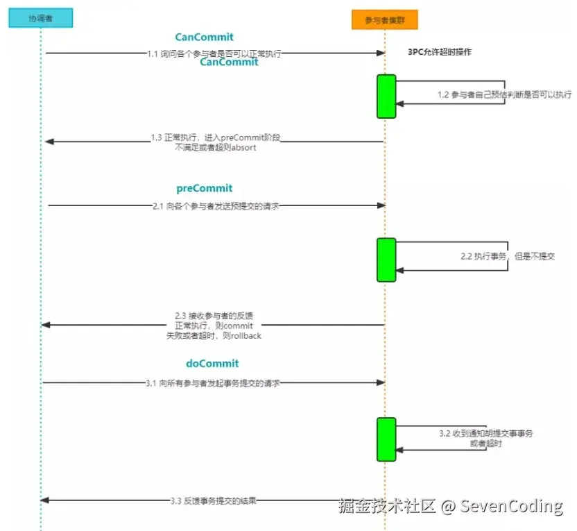 所以3PC会分为3个阶段,CanCommit 准备阶段、PreCommit 预提交阶段、DoCommit 提交阶段,处理流程如下: