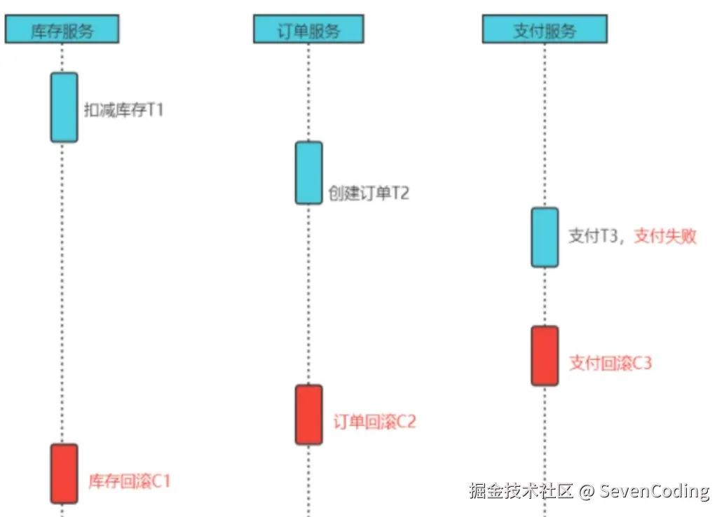 Saga 事务核心思想是将长事务拆分为多个本地短事务并依次正常提交,如果所有短事务均执行成功,那么分布式事务提交;如果出现某个参与者执行本地事务失败,则由 Saga 事务协调器协调根据相反顺序调用补偿操作,回滚已提交的参与者,使分布式事务回到最初始的状态。Saga 事务基本协议如下: