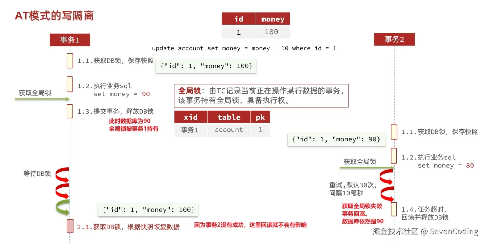 - 如果有分支事务失败,需要回滚。读取快照数据({"id": 1, "money": 100}),将快照恢复到数据库。此时数据库再次恢复为100