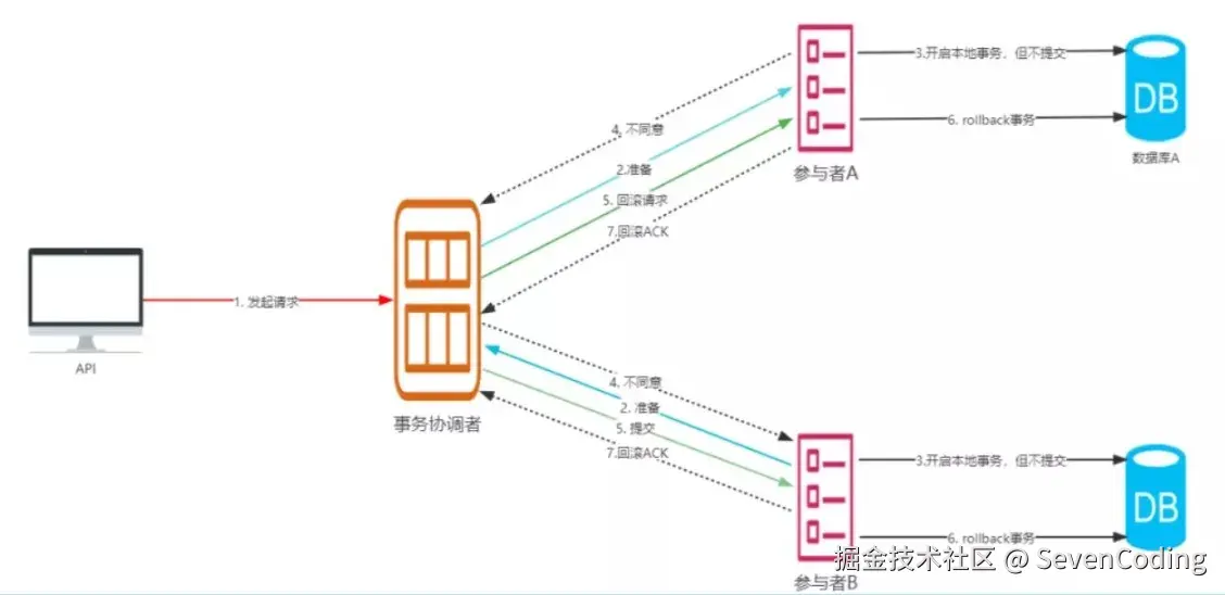 **事务回滚:**如果任意一个参与者节点在第一阶段返回的消息为中止,或者协调者节点在第一阶段的询问超时之前无法获取所有参与者节点的响应消息时,那么这个事务将会被回滚,具体流程如下: