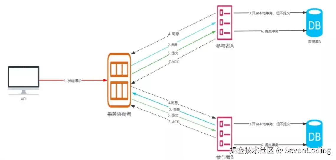 由事务协调者询问通知各个事务参与者,是否准备好了执行事务,具体流程图如下: