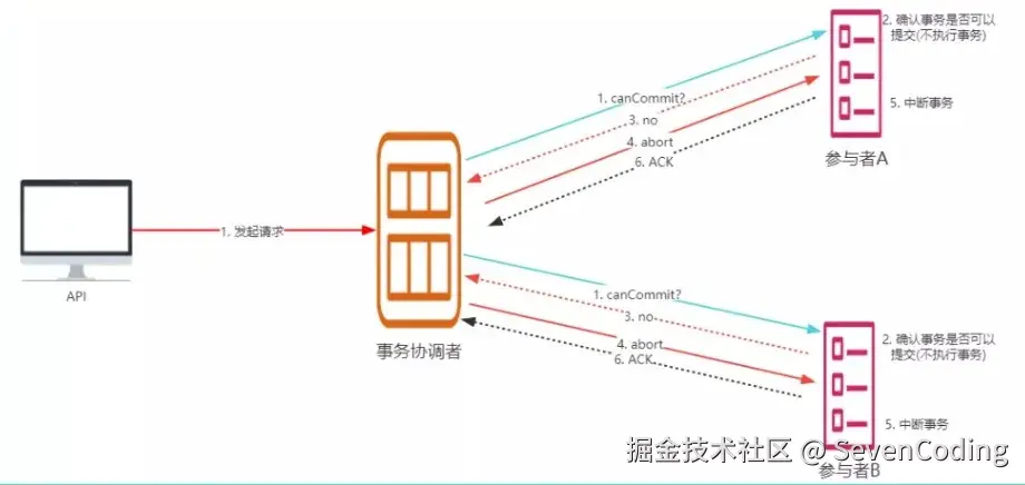 假如有任何一个参与者向协调者发送了No响应,或者等待超时之后,协调者都没有接到参与者的响应,那么就执行事务的中断,流程如下: